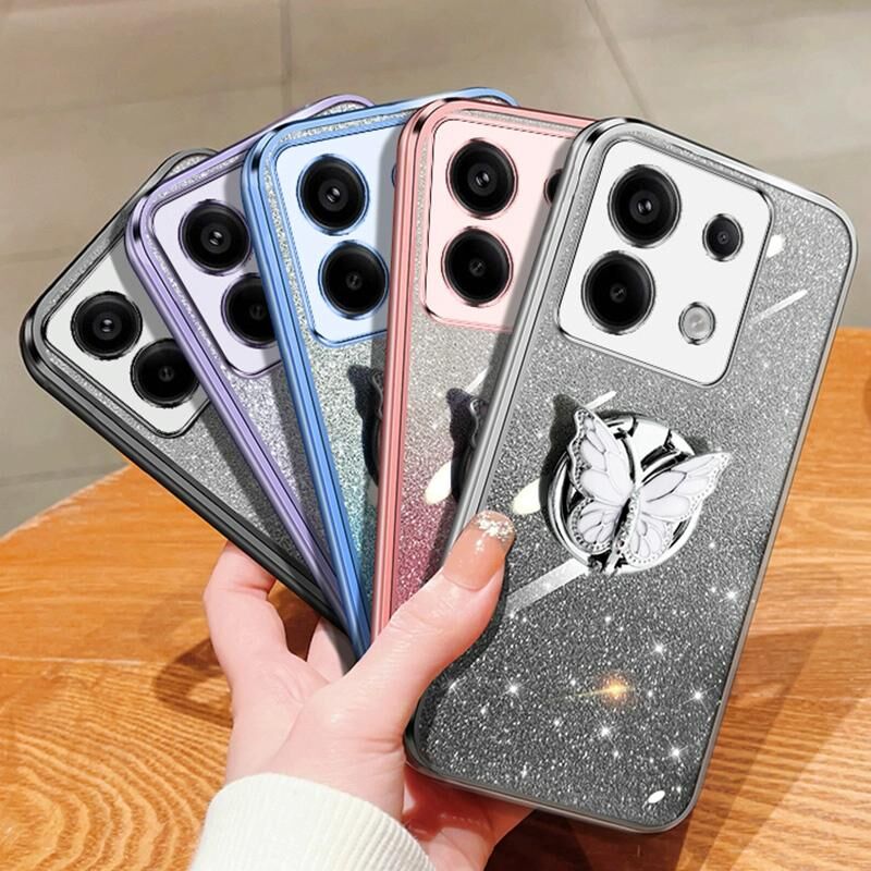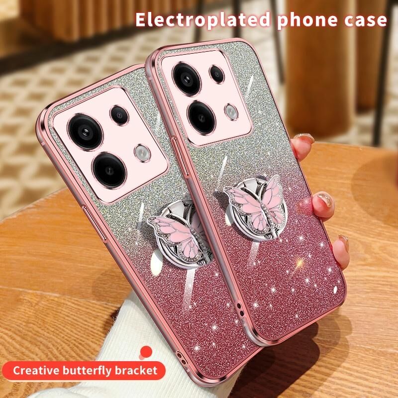Για Redmi Σημείωση 13 Pro επιμεταλλωμένο διαβάθμιση Glitter πεταλούδα κάτοχος TPU τηλέφωνο υπόθεση (ροζ)