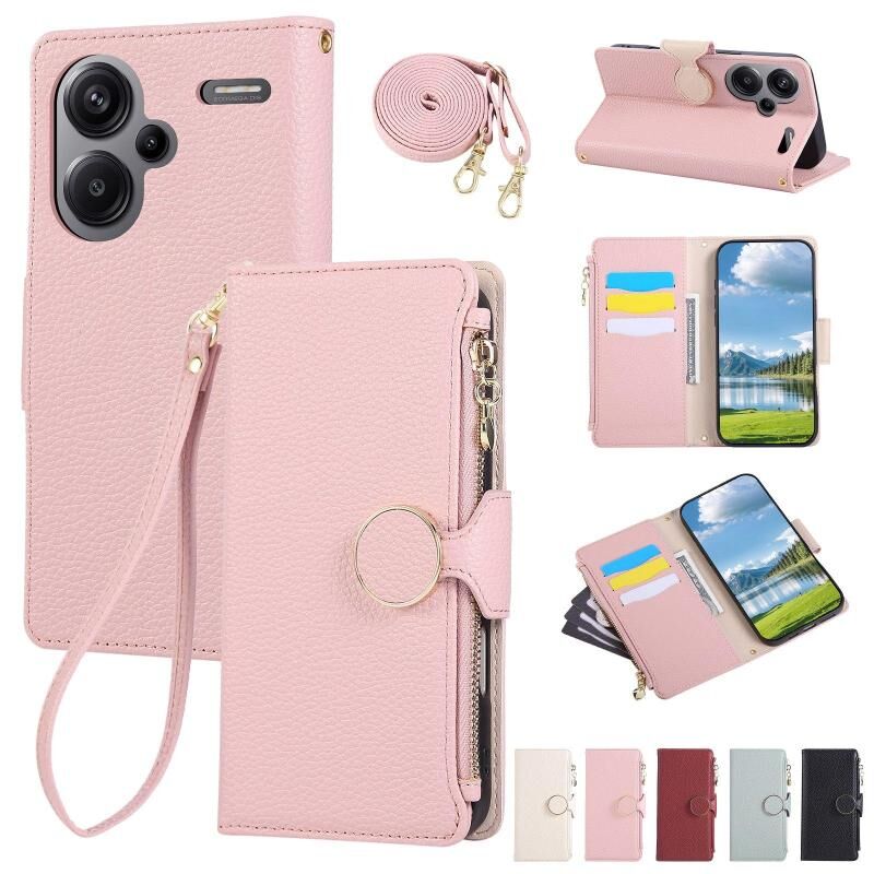 Θήκη κινητού τηλεφώνου από δέρμα με φερμουάρ και αγκράφα για Redmi Note 13 Pro+ με λουρί χιαστί (Ροζ)