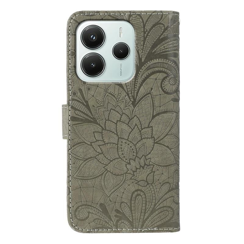 For Redmi Note 14 4G 163.25mm Global Lace Flower Embossing Flip Leather Phone Case(Grey)