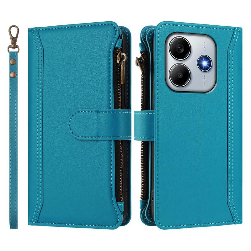 Για Redmi Note 14 4G, θήκη δέρματος με μαγνητικό κλείσιμο, 9 θέσεις για κάρτες, φερμουάρ και λουρί χειρός (Τουρκουάζ)