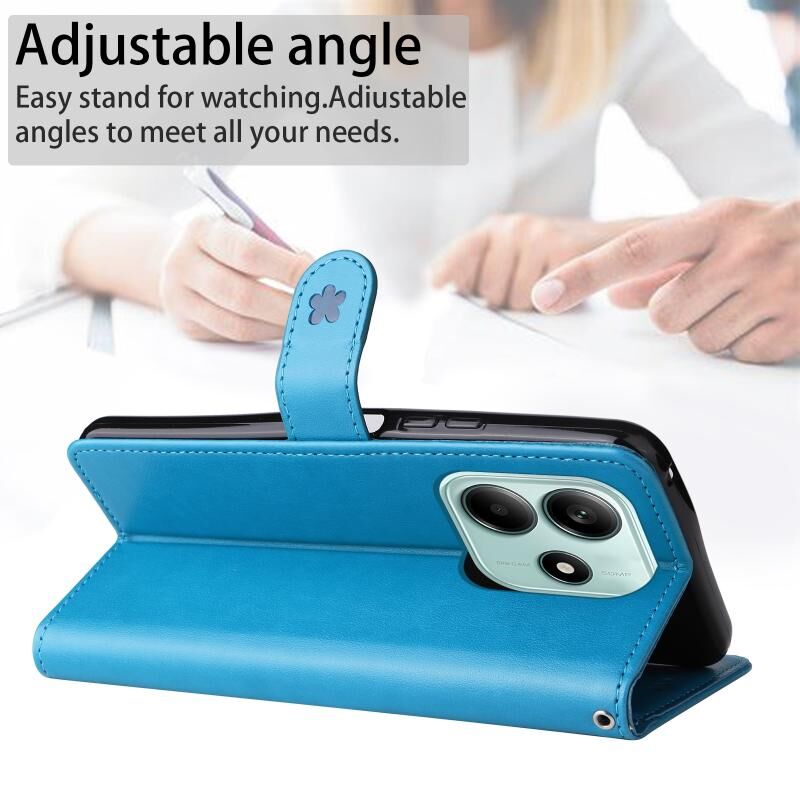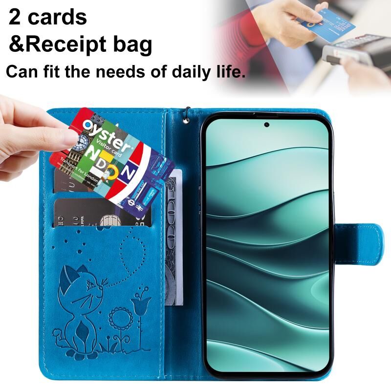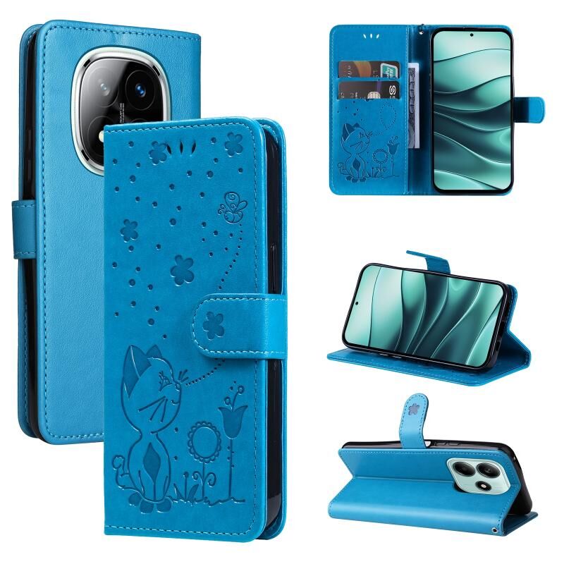 Θήκη τηλεφώνου από δέρμα με ανάγλυφο σχέδιο γάτας και μέλισσας για Redmi Note 14 5G (Μπλε)