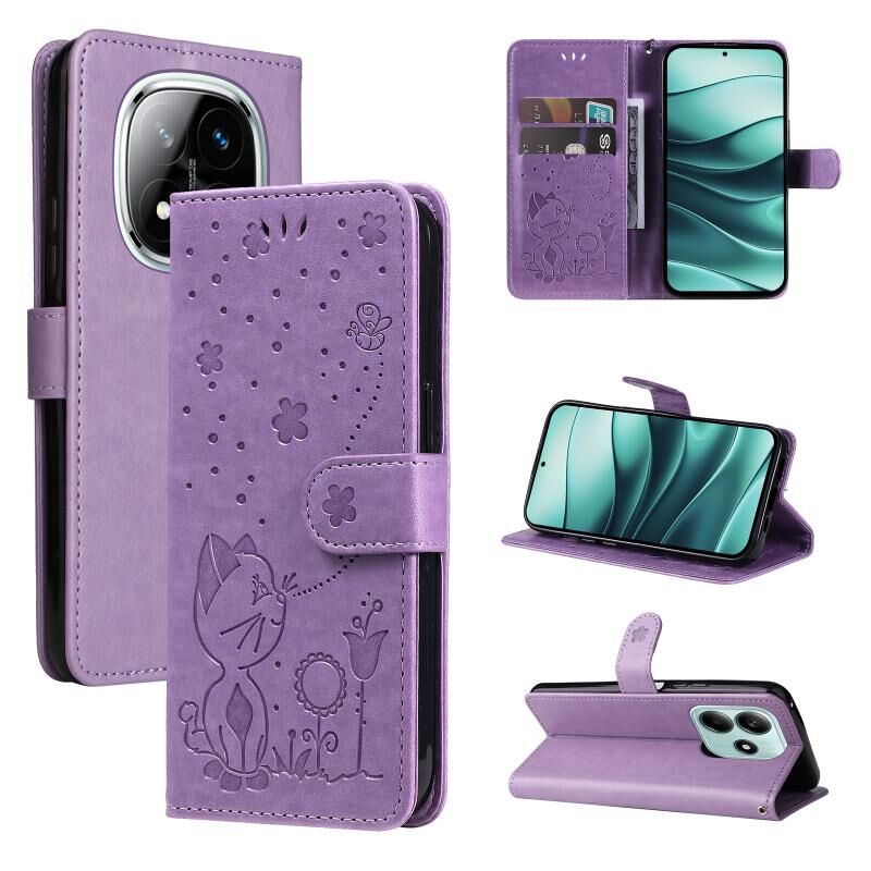 Θήκη τηλεφώνου από δέρμα με ανάγλυφο σχέδιο γάτας και μέλισσας για Redmi Note 14 5G (Μπλε)
