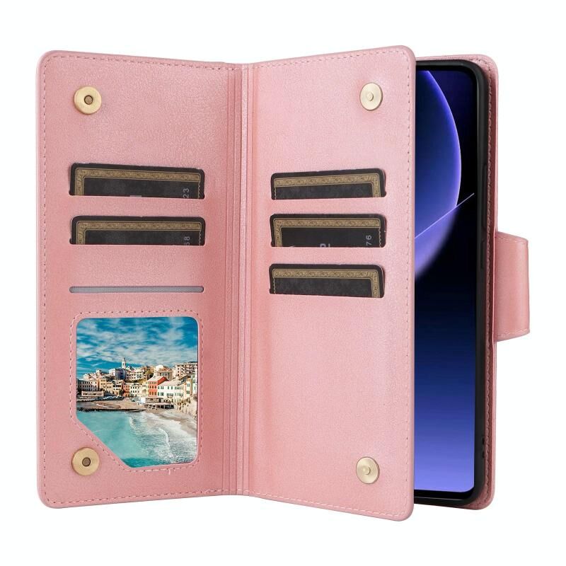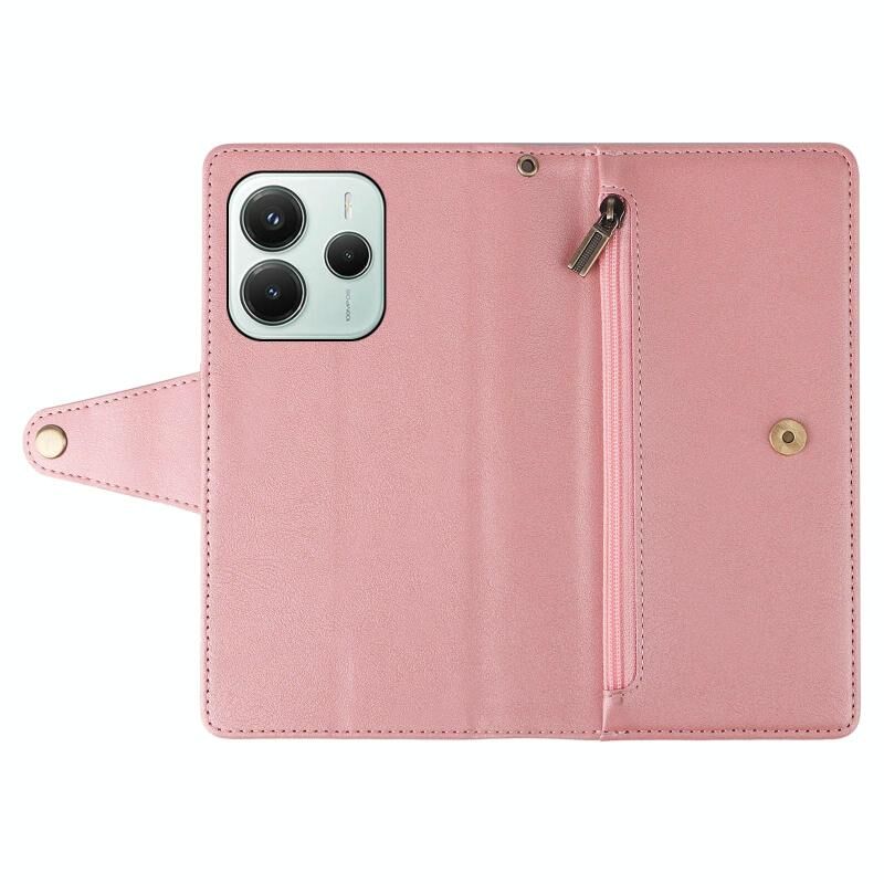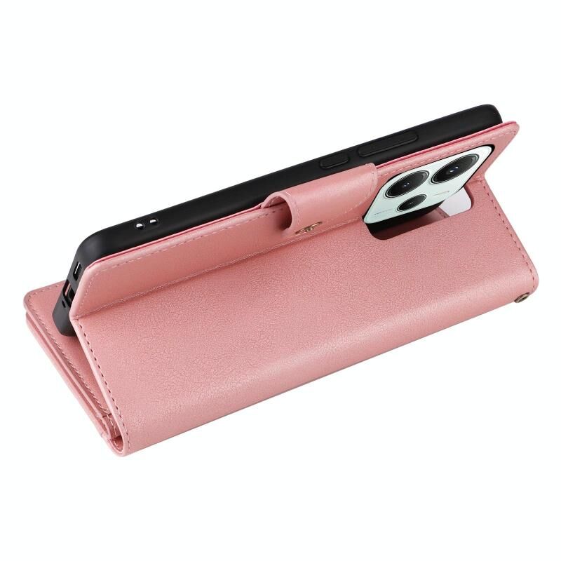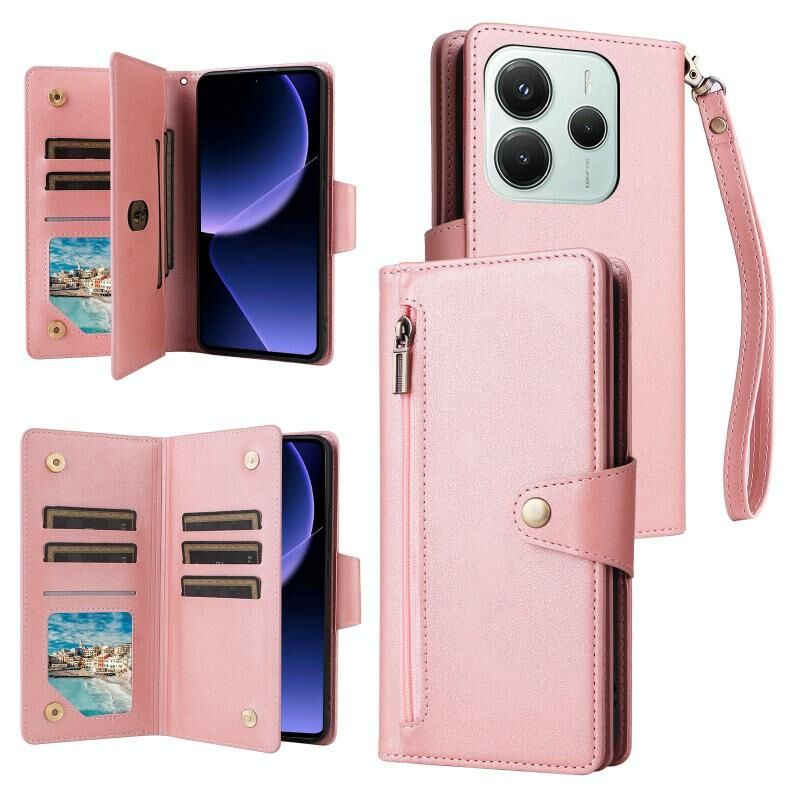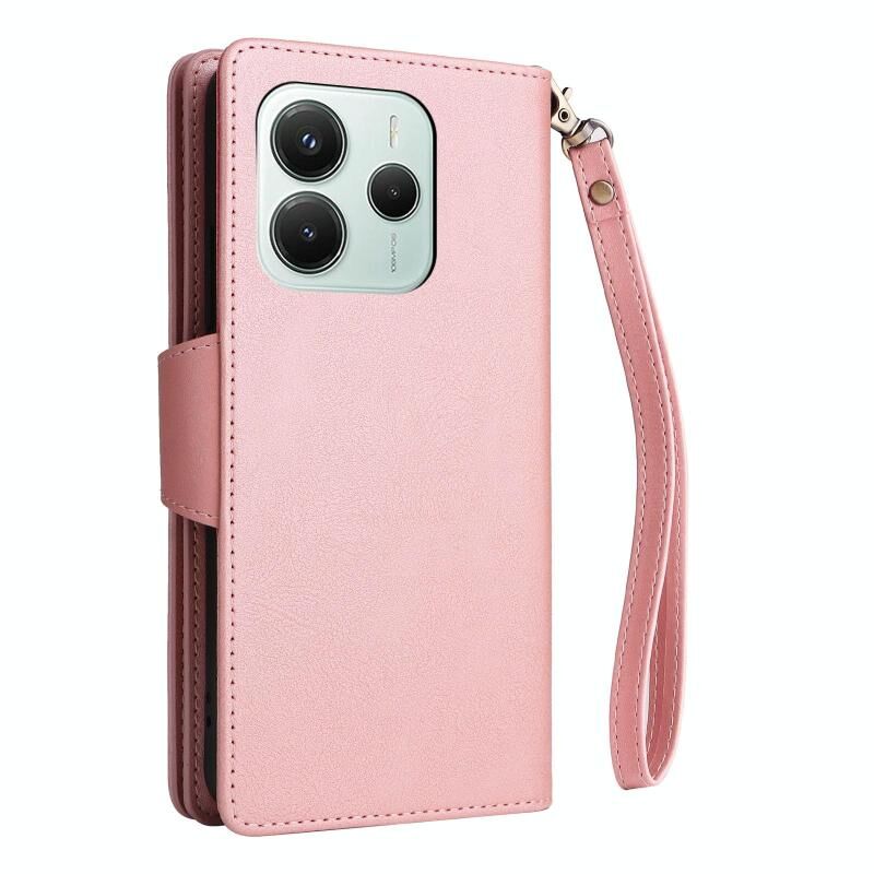 Θήκη τηλεφώνου από δέρμα τριπλής πτυχής με αγκράφα καρφί για Redmi Note 14 5G (Χρυσορόδινο) - χωρητικότητα 9 καρτών.