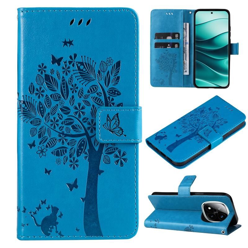 Θήκη τηλεφώνου από δέρμα με σχέδιο ανάγλυφου δέντρου & γάτας, τύπου flip, για Redmi Note 14 Pro / 14 Pro+ 5G (Μπλε)