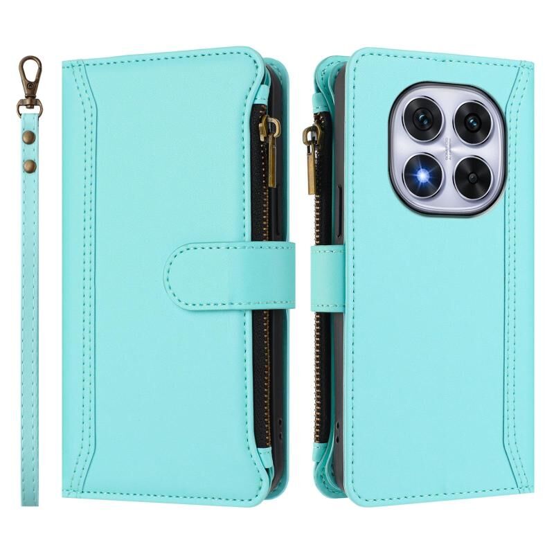 For Redmi Note 14 Pro 4G Magnetic Closure 9 Card Slots Zipper Leather Case with Hand Strap(Mint Green)