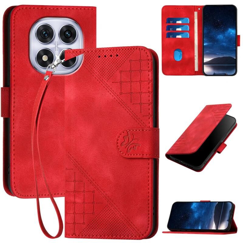Θήκη τηλεφώνου από δέρμα με ανάγλυφο σχέδιο πλέγματος και πεταλούδας για Redmi Note 14 Pro 4G YX0080 με κορδόνι (Κόκκινο)