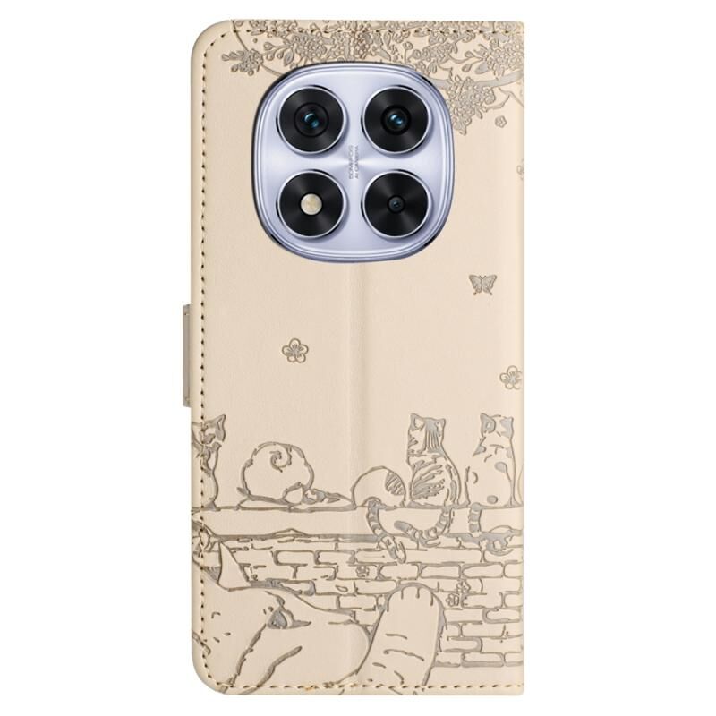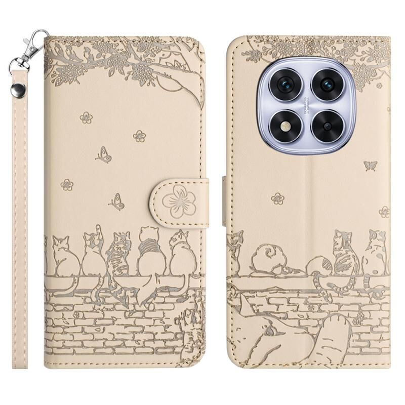 Θήκη τηλεφώνου από δέρμα με ανάγλυφο σχέδιο γάτας για Redmi Note 14 Pro 5G με κορδόνι (Μπεζ)