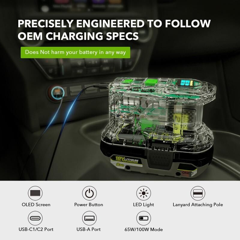 3. 100W super-fast flash charging, compatible with all Ryobi 18V batteries.