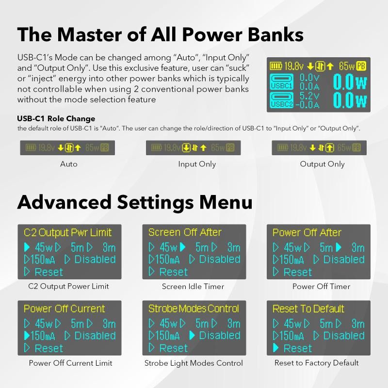 6. Energy flow control system (exclusive to USB-C1): USB-C1 supports mode switching (auto/only input/only output), breaking the traditional power bank's unidirectional transmission limitation and achieving active energy management.