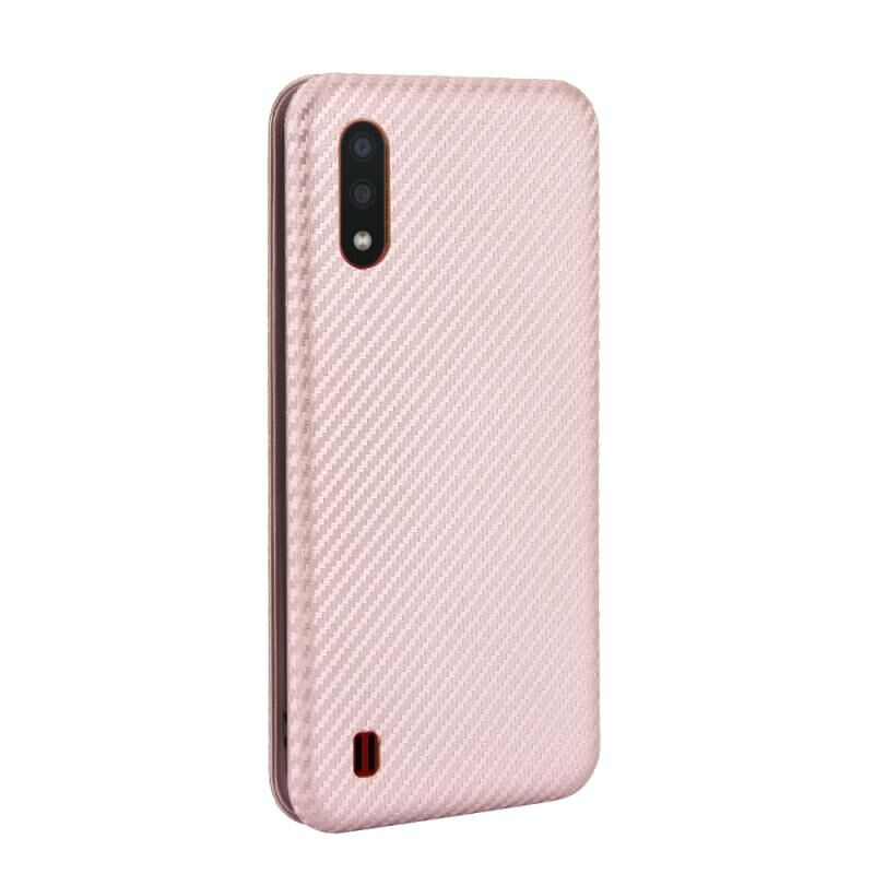 Θήκη για Samsung Galaxy A01 με υφή ανθρακονήματος, οριζόντια, από TPU + PC + Δερματίνη PU με κορδόνι & θήκη για κάρτες (ρόζ)