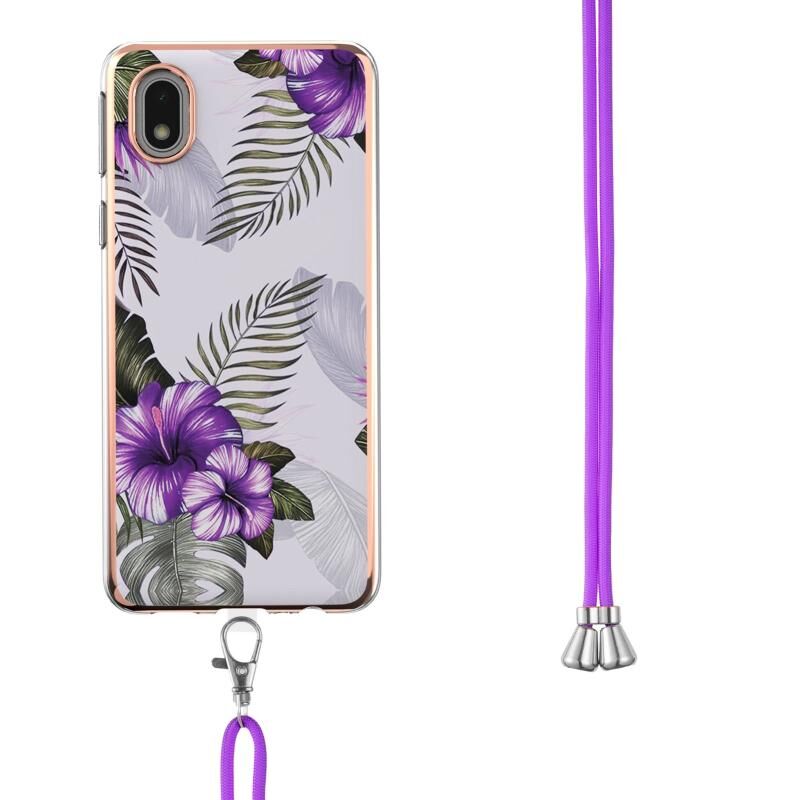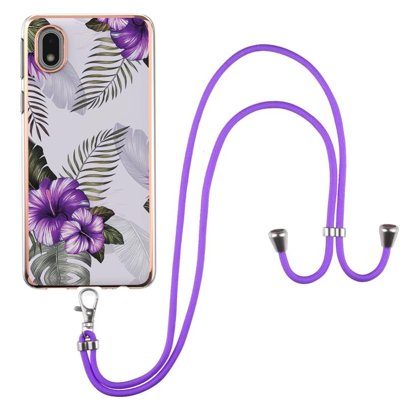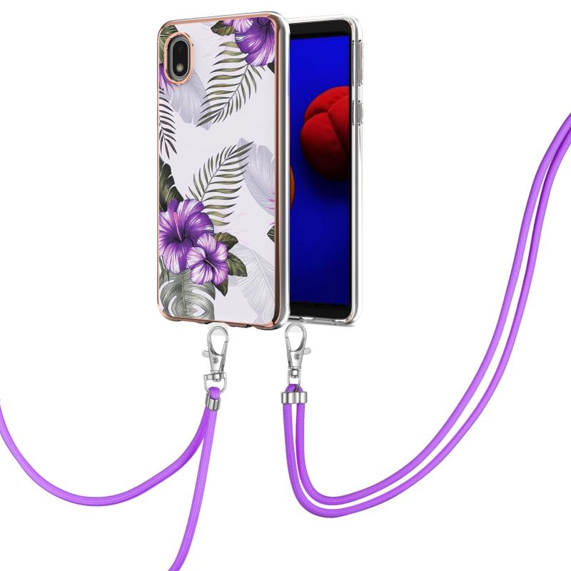 For Samsung Galaxy A01 Core Electroplating Pattern IMD TPU Shockproof Case with Neck Lanyard(Purple Flower)