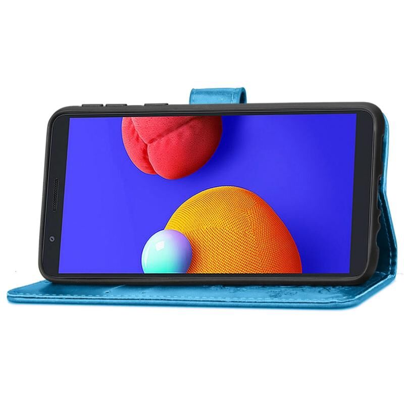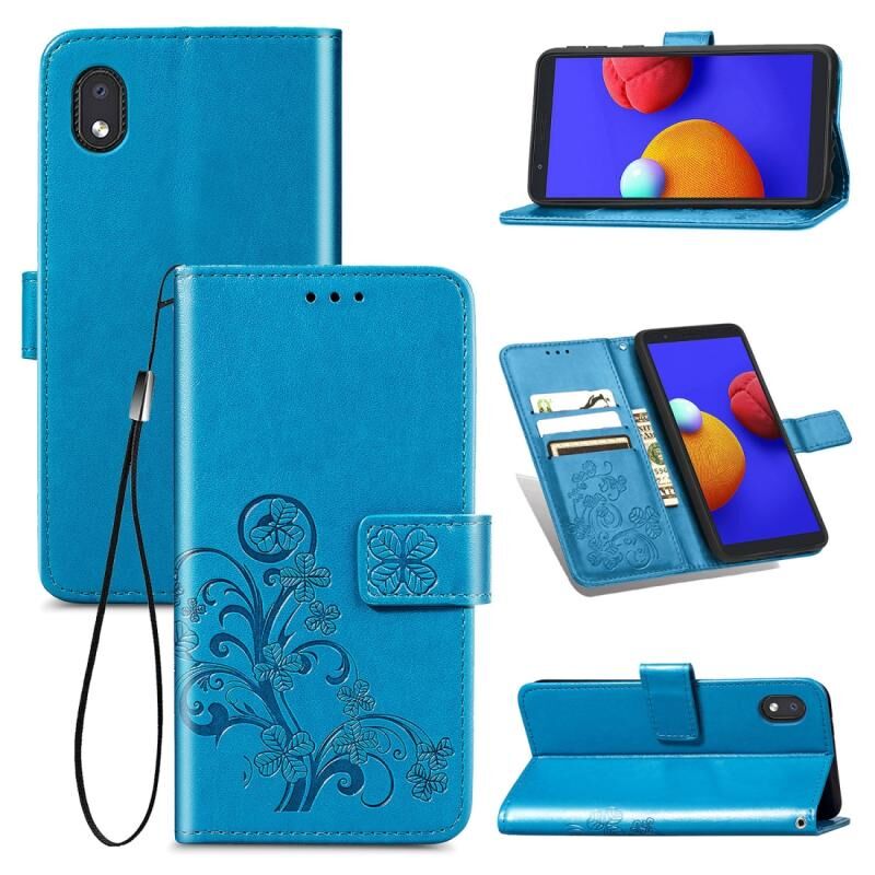 Θήκη δερμάτινη για Samsung Galaxy A01 Core με σχέδιο τριφυλλιού, ανάγλυφο κούμπωμα, προστασία κινητού, λουρί, θήκη για κάρτες, πορτοφόλι και στήριξη (Χρυσό ροζ)