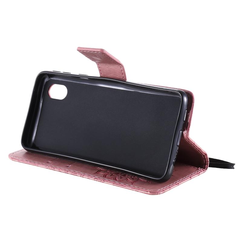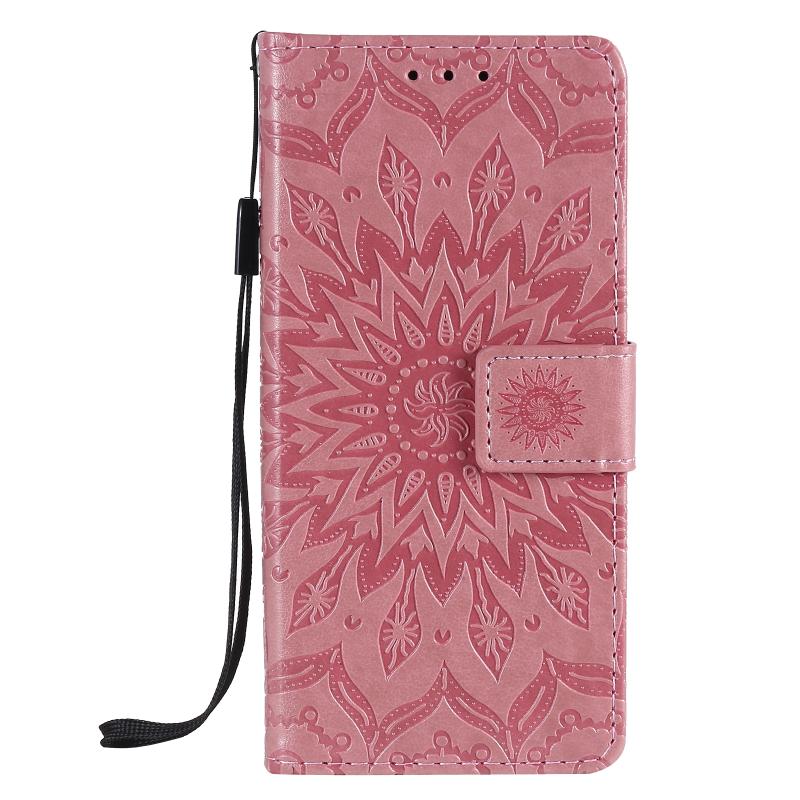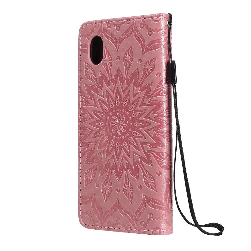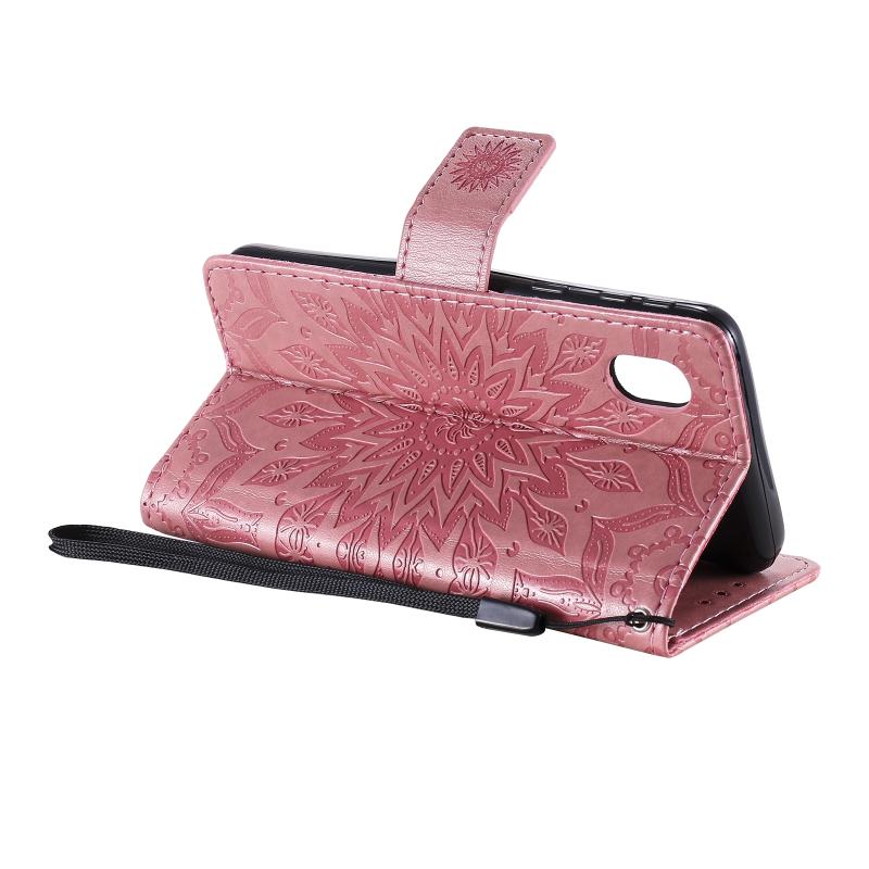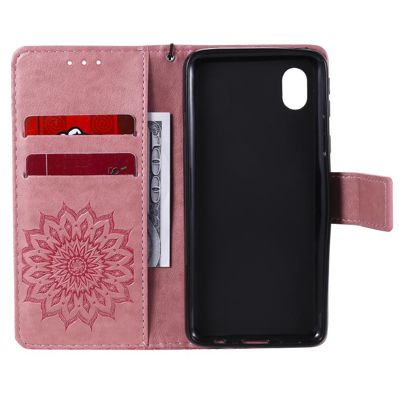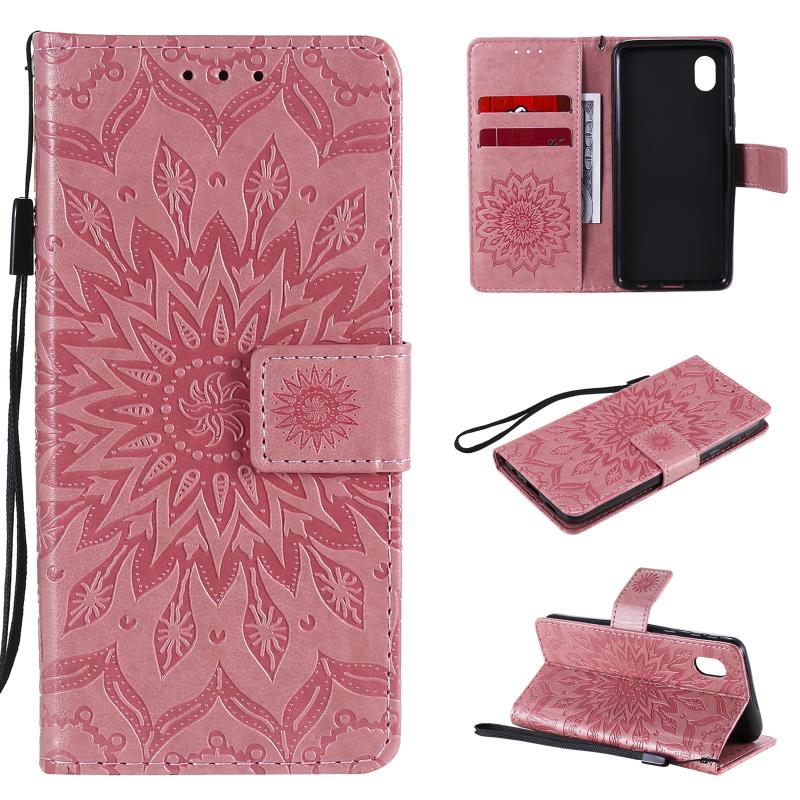 For Samsung Galaxy A01 Core Pressed Printing Sunflower Pattern Horizontal Flip PU Leather Case with Holder & Card Slots & Wallet & Lanyard(Pink)
