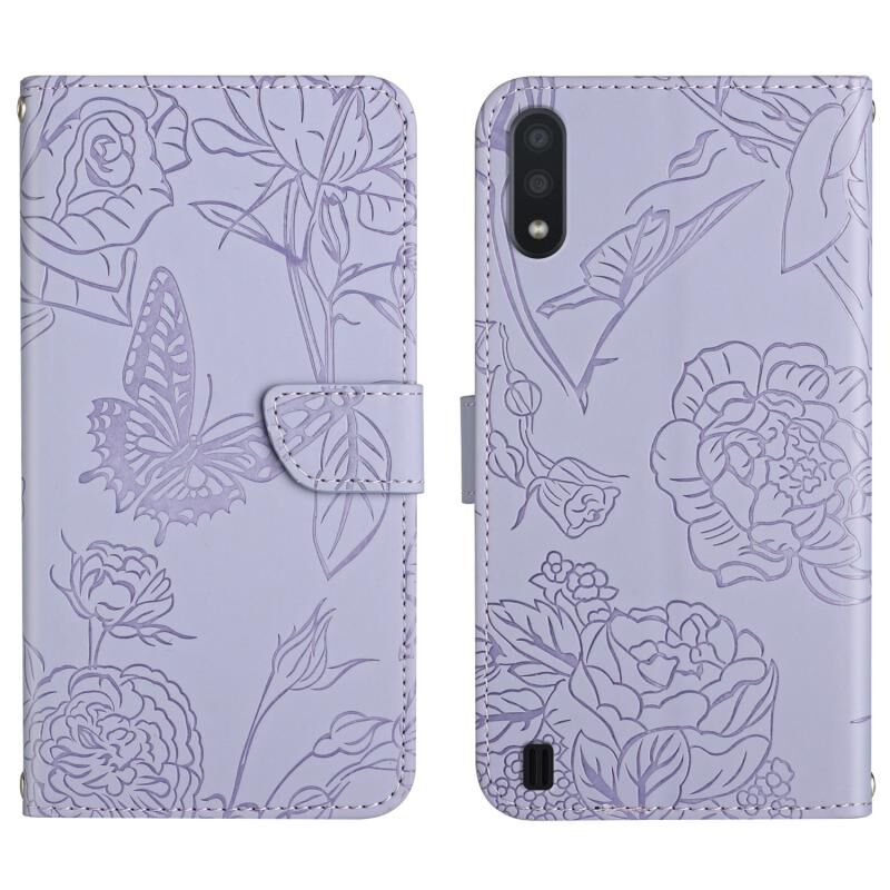 Θήκη τηλεφώνου Samsung Galaxy A01 με ανάγλυφο σχέδιο πεταλούδας και παιώνιας από δέρμα (Κόκκινο)