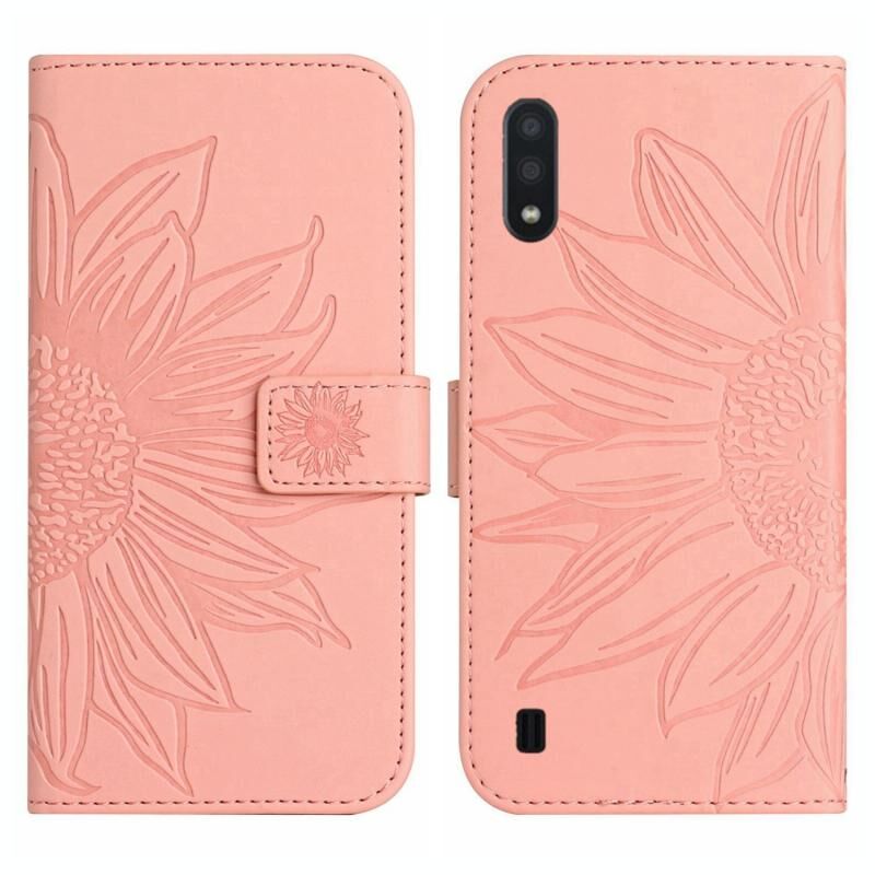 Για το Samsung Galaxy A01 δέρμα αίσθηση Sun Flower μοτίβο Flip δέρμα τηλέφωνο υπόθεση με κορδόνι (ρόζ)