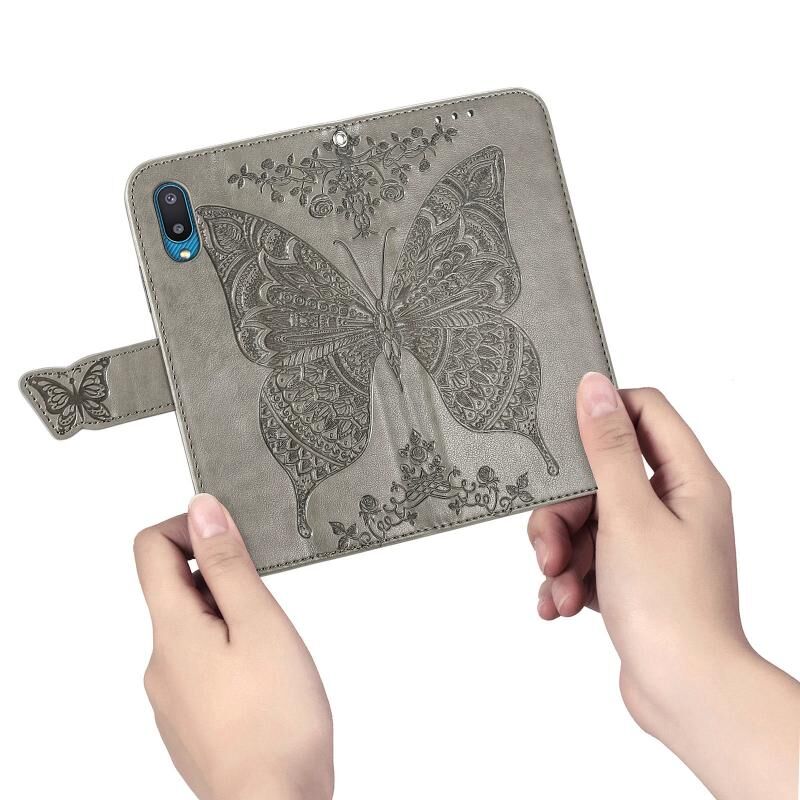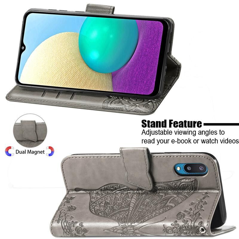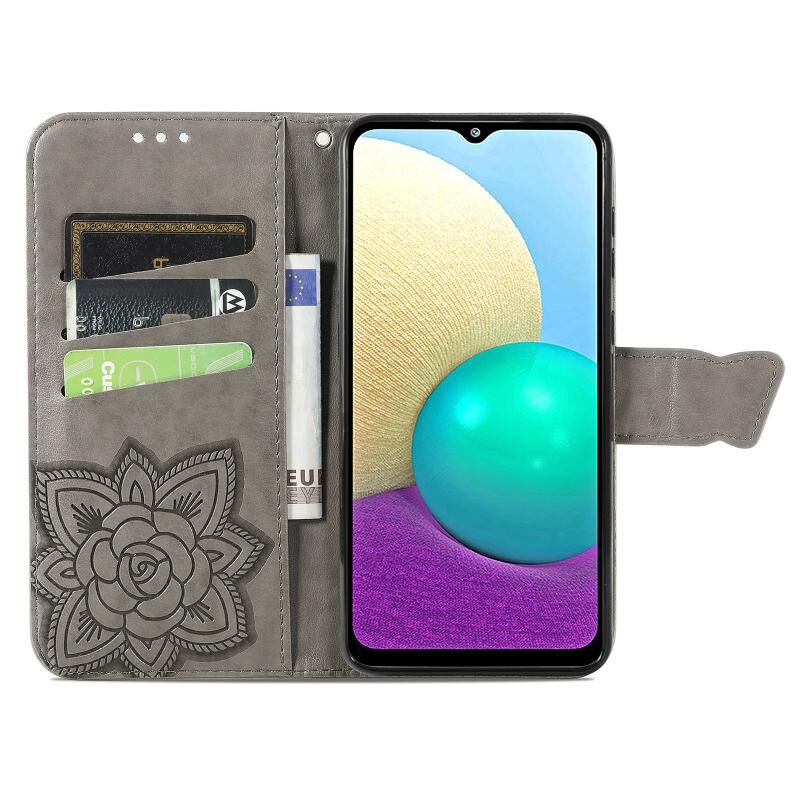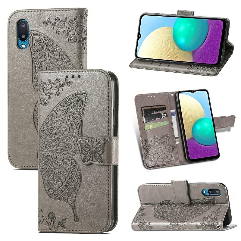 Για Samsung Galaxy A02 πεταλούδα αγάπη λουλούδι ανάγλυφο οριζόντια Flip δερμάτινη θήκη με στήριγμα & υποδοχή για κάρτες & πορτοφόλι & κορδόνι (γκρι)