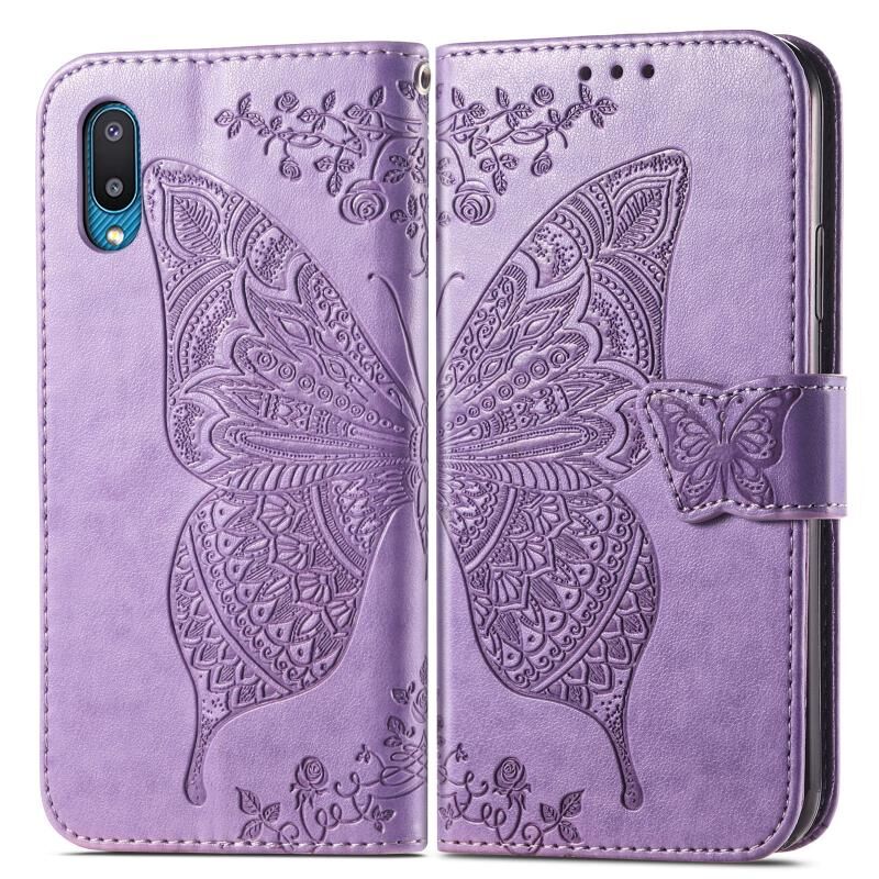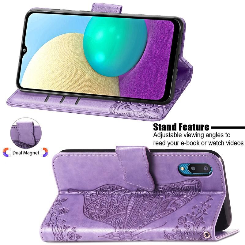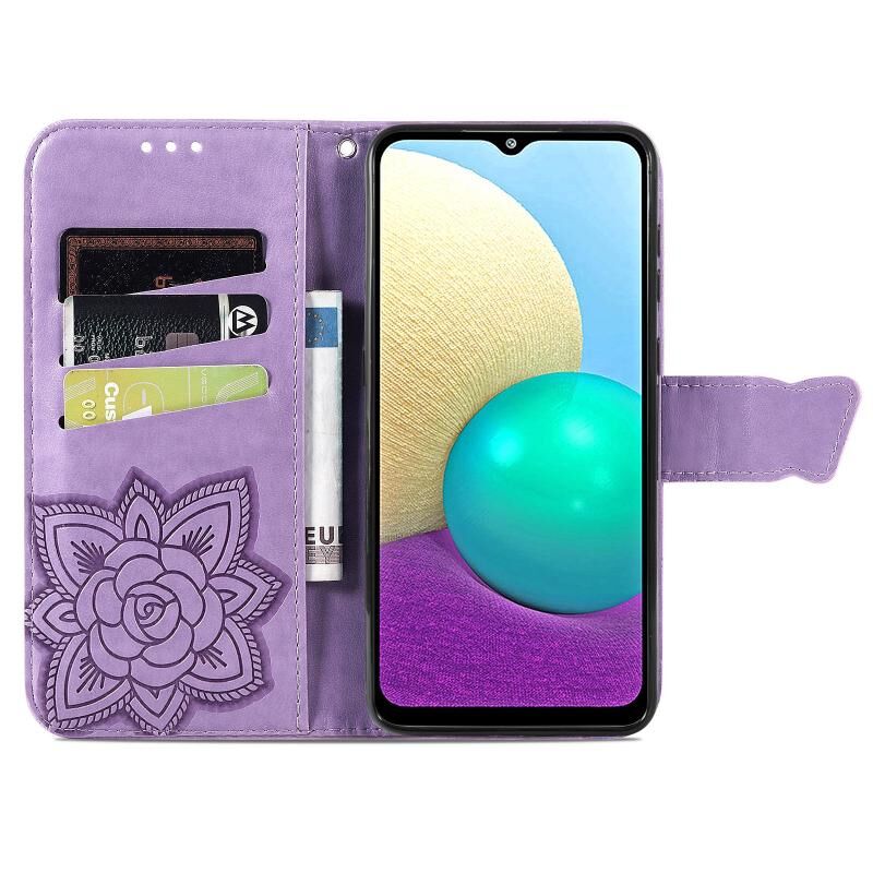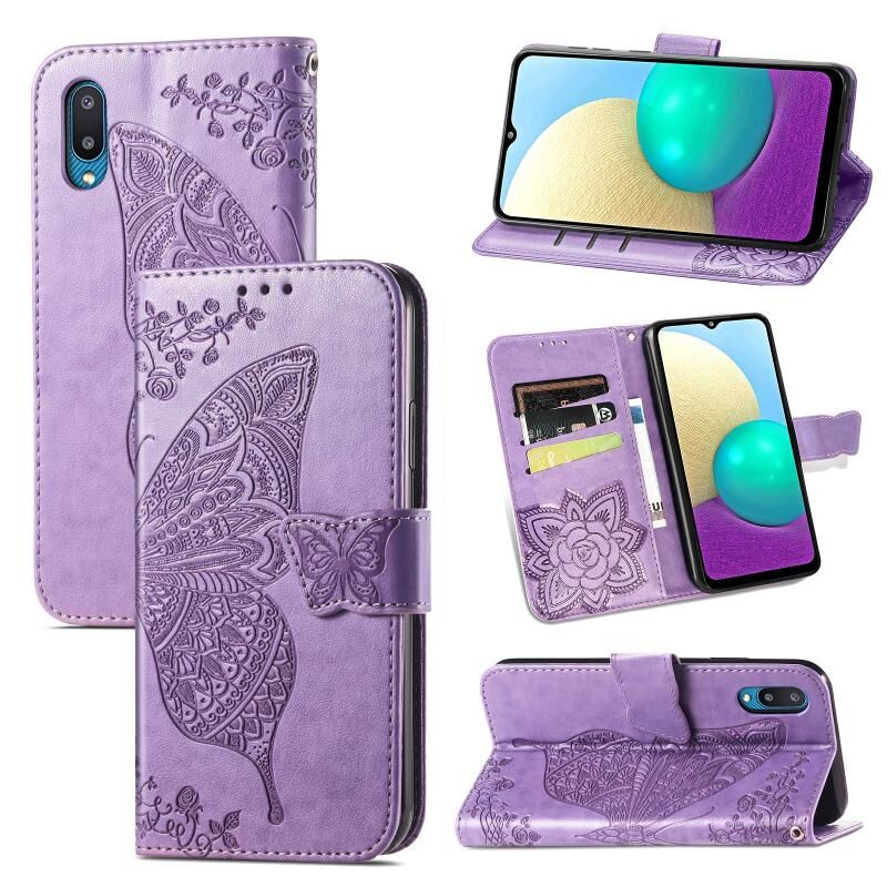 Για Samsung Galaxy A02 πεταλούδα αγάπη λουλούδι ανάγλυφο οριζόντια Flip δερμάτινη θήκη με βραχίονα & υποδοχή για κάρτες & πορτοφόλι & κορδόνι (ανοιχτό μοβ)