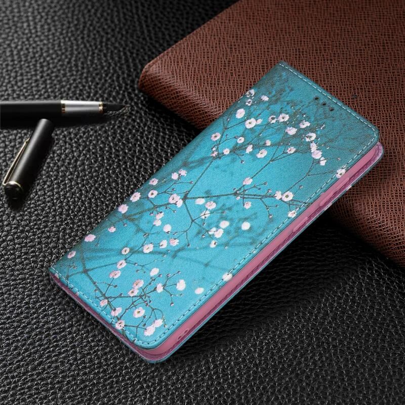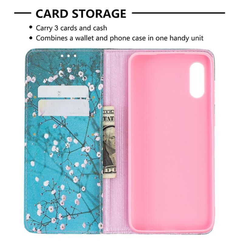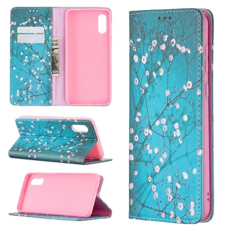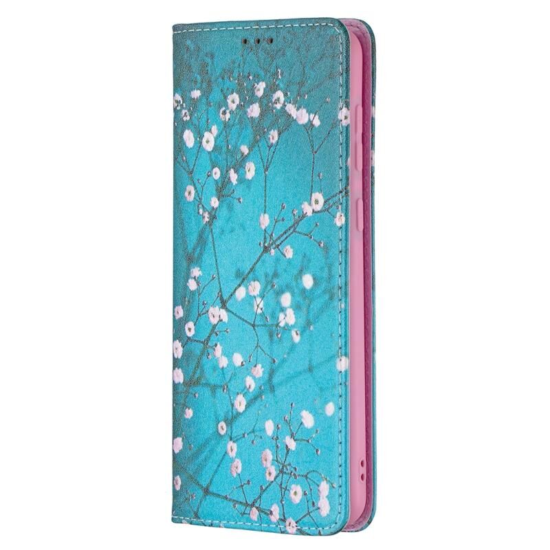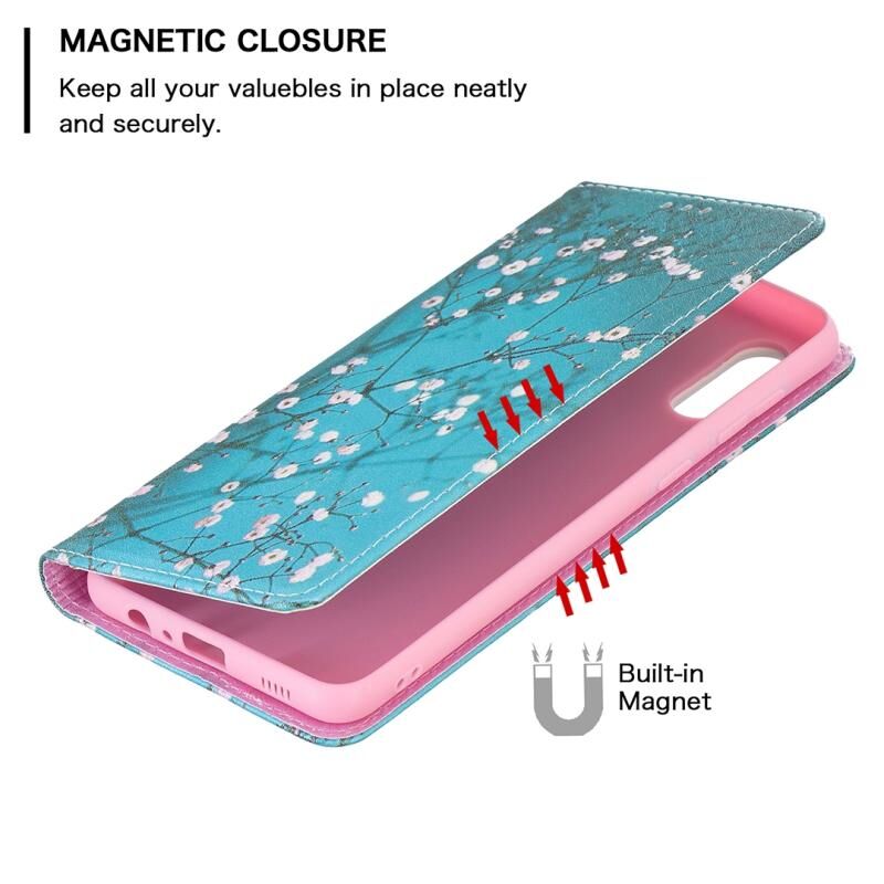 Θήκη Samsung Galaxy A02 με πολύχρωμο σχέδιο, αόρατο μαγνητικό, οριζόντιο flip από δερματίνη PU με βάση & θήκες για κάρτες & πορτοφόλι (Λουλούδι Δαμασκηνιάς)