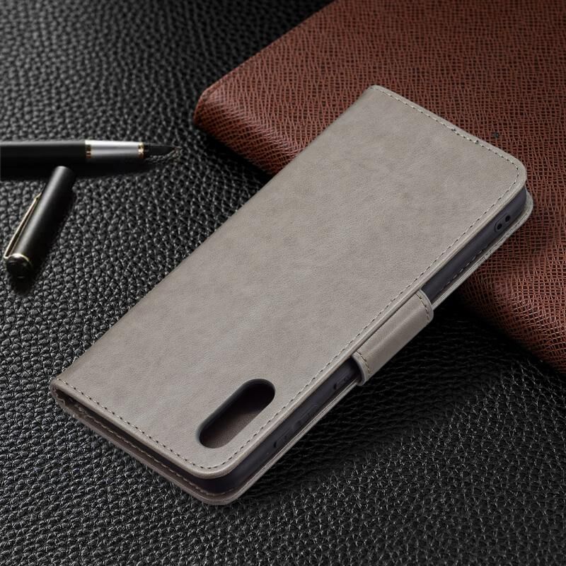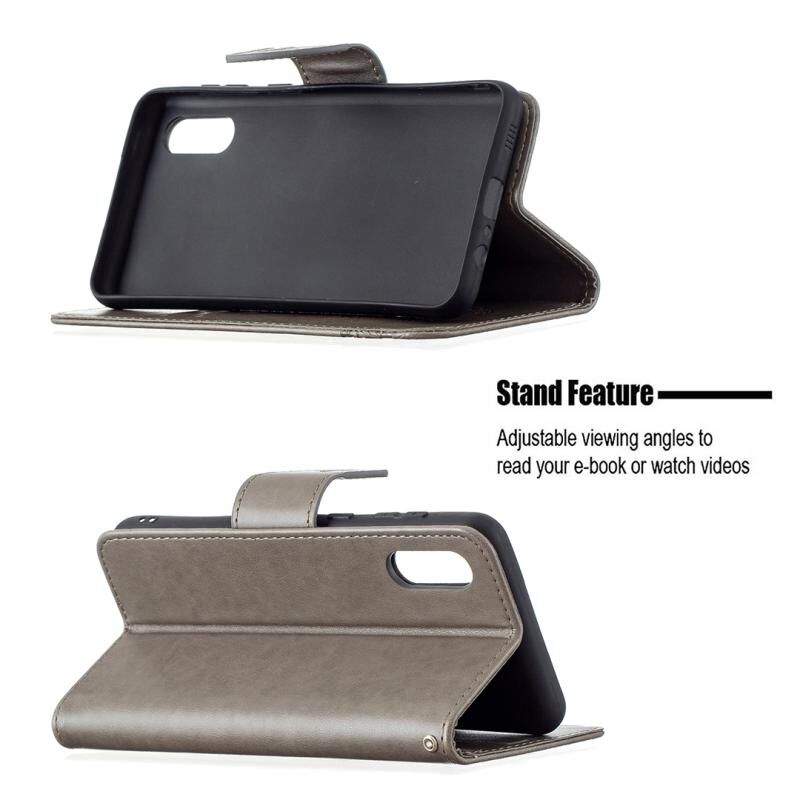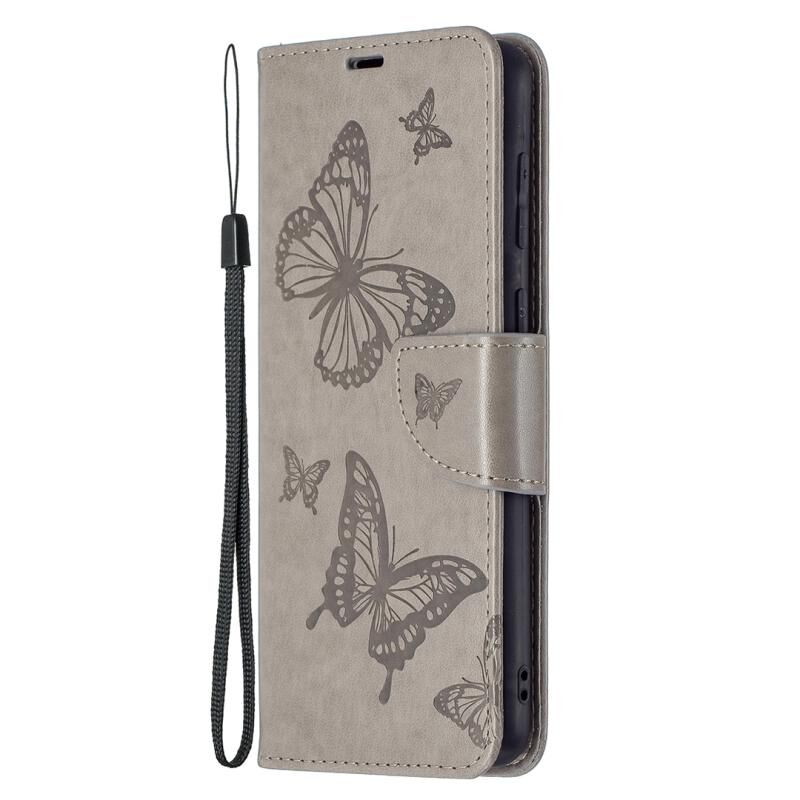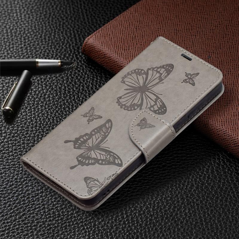 Για Samsung Galaxy A02 Ανάγλυφο δύο πεταλούδες μοτίβο οριζόντια Flip PU δέρμα υπόθεση με κάτοχο & υποδοχή για κάρτες & πορτοφόλι & Lanyard (γκρι)