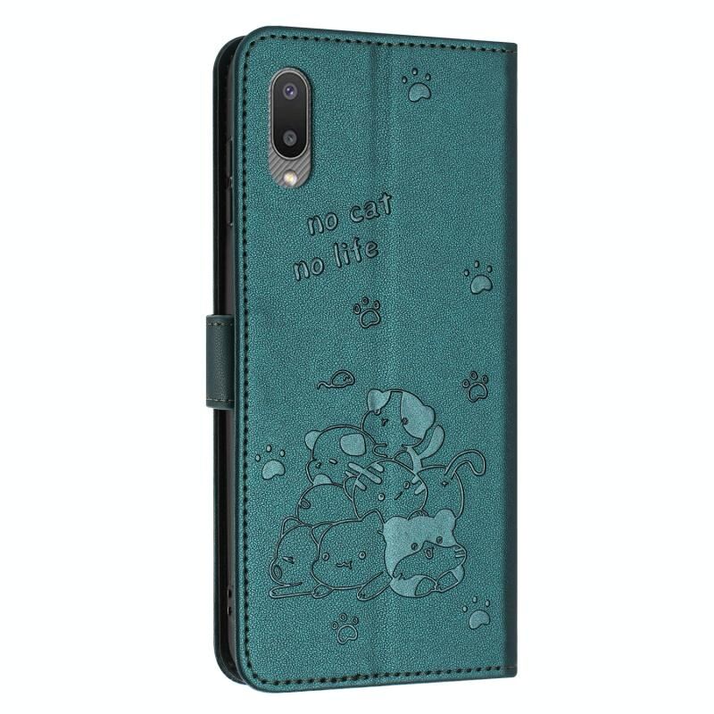 Θήκη δέρματος τηλεφώνου με ανάγλυφο γατάκι και λουρί για Samsung Galaxy A02 EU / M02 (Σκούρο πράσινο)