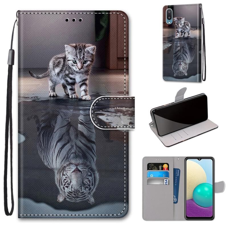 Θήκη για Samsung Galaxy A02 / M02 με πολύχρωμο σχέδιο, υφή διασταυρούμενης υφής, οριζόντια αναδίπλωση από δερματίνη PU με βάση & υποδοχές καρτών & πορτοφόλι & κορδόνι (Η γάτα γίνεται τίγρης)