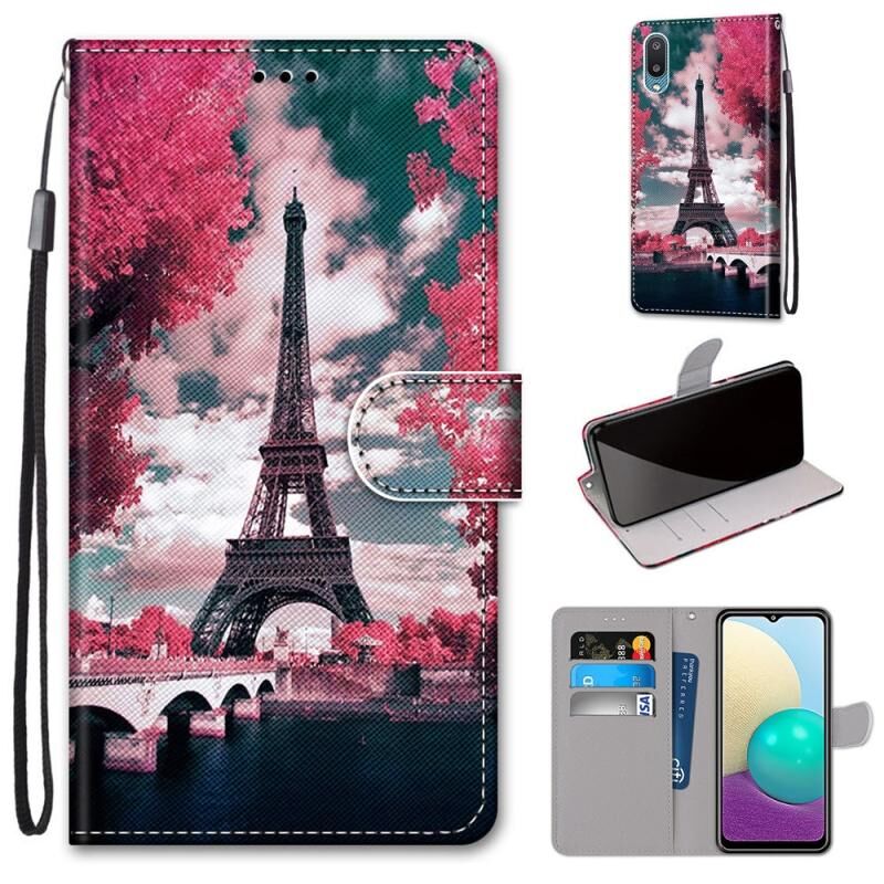 Θήκη για Samsung Galaxy A02 / M02 με πολύχρωμο σχέδιο, υφή σταυρού, οριζόντια αναδίπλωση από δερματίνη PU με βάση στήριξης & θήκες καρτών & πορτοφόλι & κορδόνι (Ροζ Λουλούδι Πύργος της Γέφυρας).