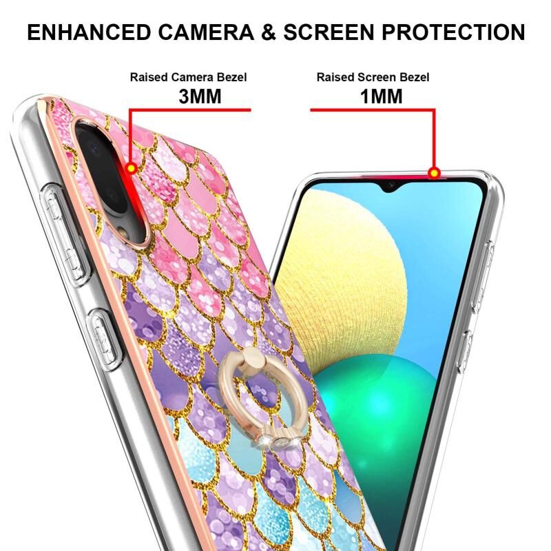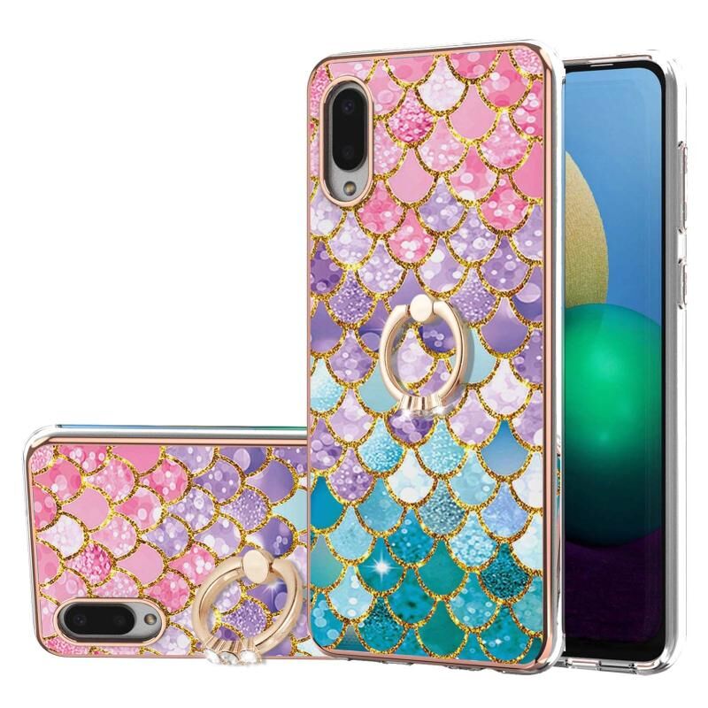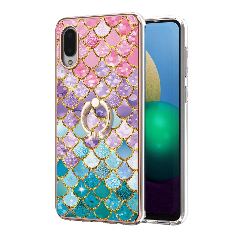 For Samsung Galaxy A02/M02 Electroplating Pattern IMD TPU Shockproof Case with Rhinestone Ring Holder(Colorful Scales)