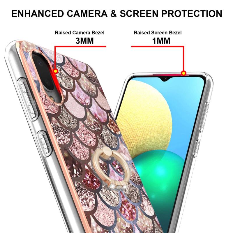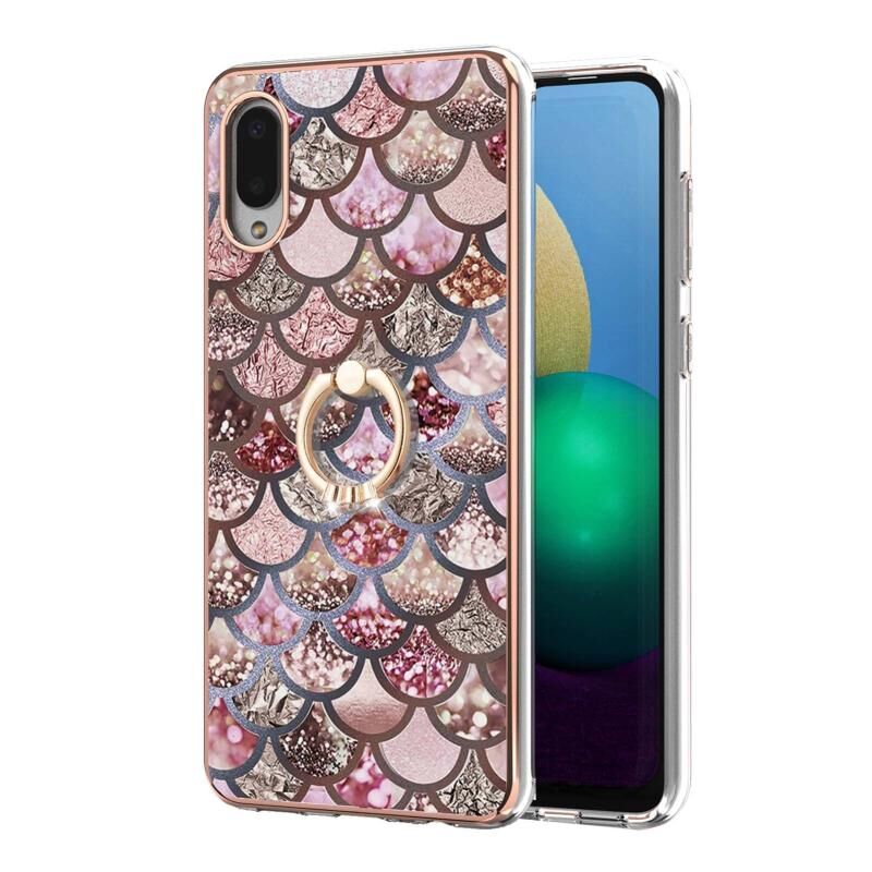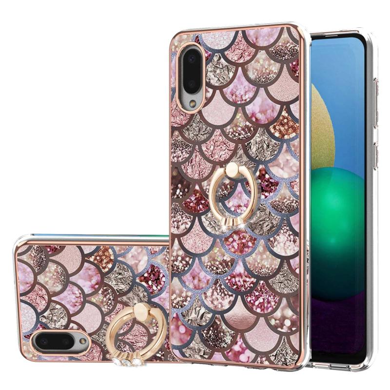 For Samsung Galaxy A02/M02 Electroplating Pattern IMD TPU Shockproof Case with Rhinestone Ring Holder(Pink Scales)