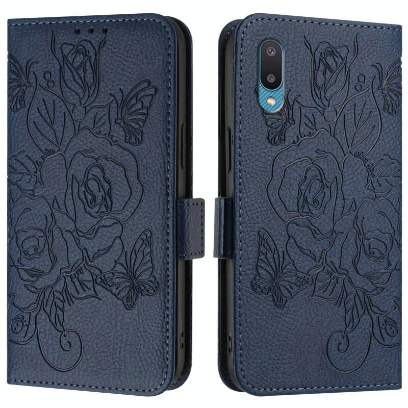 Για Samsung Galaxy A02 / M02 ανάγλυφο Rose RFID Anti-theft δερμάτινη θήκη τηλεφώνου (Σκούρο μπλε)