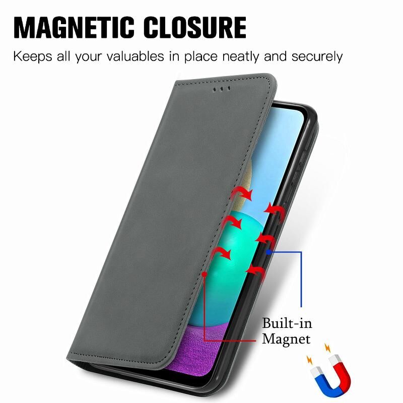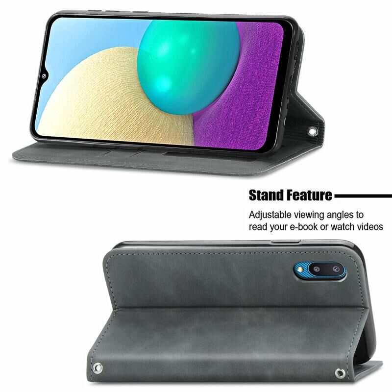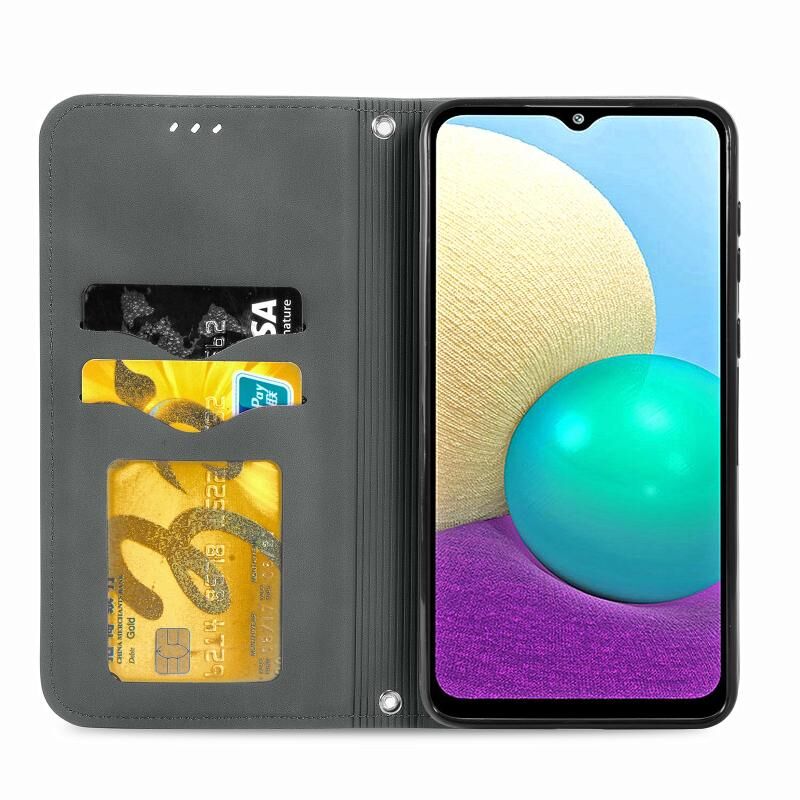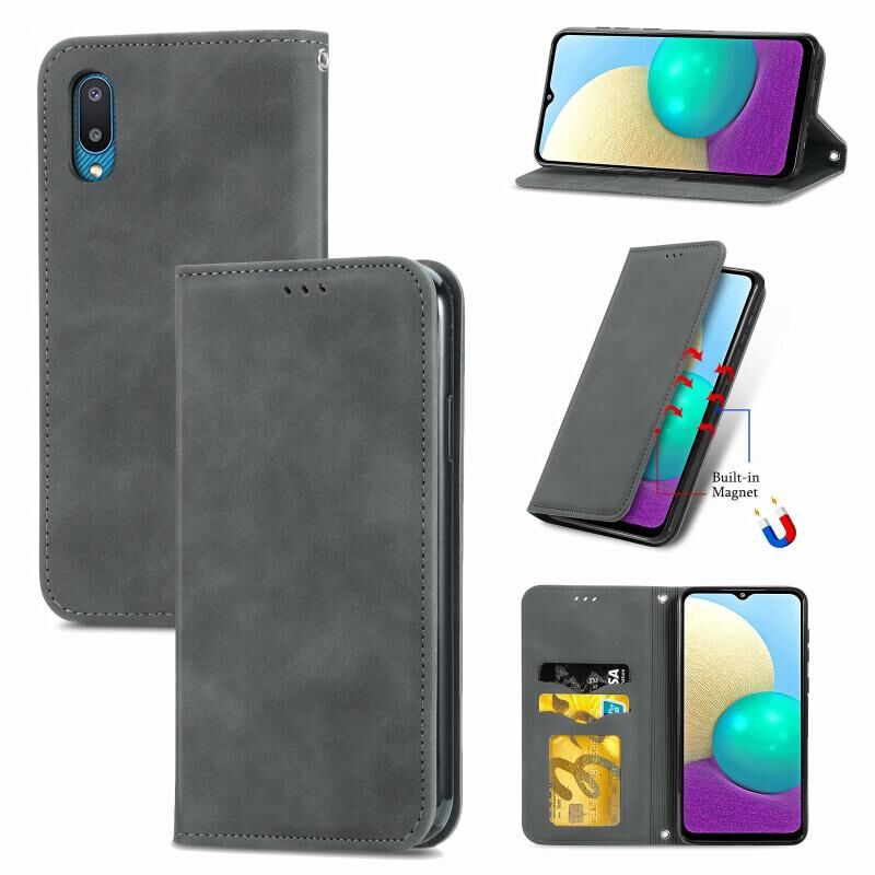 Για Samsung Galaxy A02 Retro Skin Feel Business μαγνητική οριζόντια Flip δερμάτινη θήκη με υποδοχές για κάρτες & πορτοφόλι & πλαίσιο φωτογραφιών (γκρι)