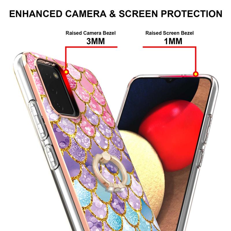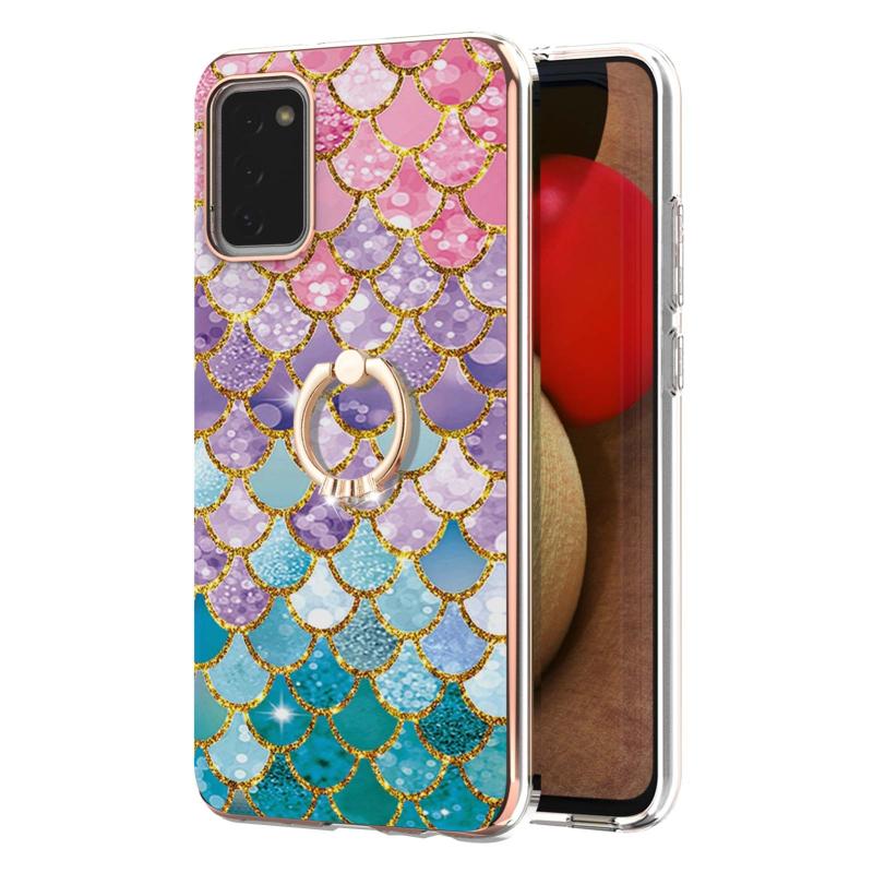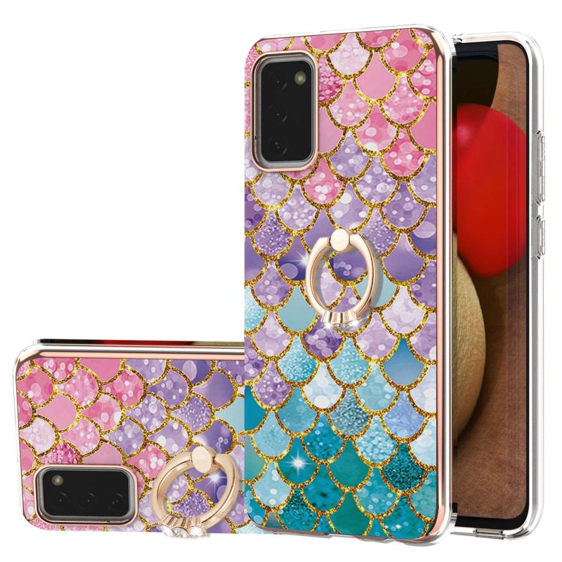 For Samsung Galaxy A02s 164mm Electroplating Pattern IMD TPU Shockproof Case with Rhinestone Ring Holder(Colorful Scales)