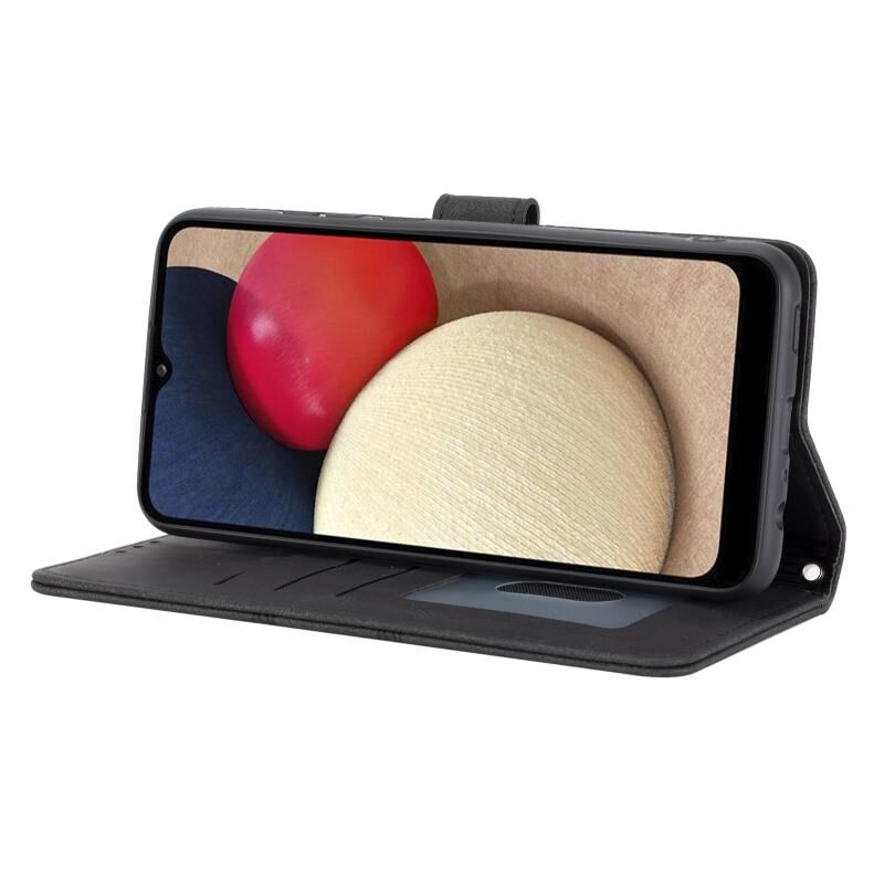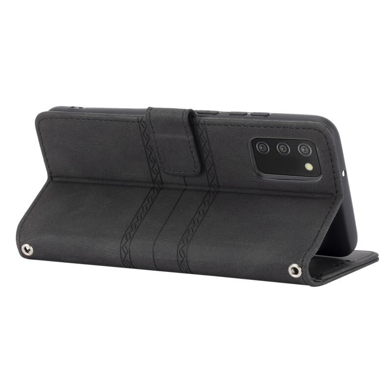 Για Samsung Galaxy A02s 164mm ανάγλυφο ριγέ μαγνητική πόρπη PU + TPU οριζόντια Flip δερμάτινη θήκη με θήκη & υποδοχή κάρτας & πορτοφόλι & κορνίζα φωτογραφιών & σφεντόνα (Μαύρο)