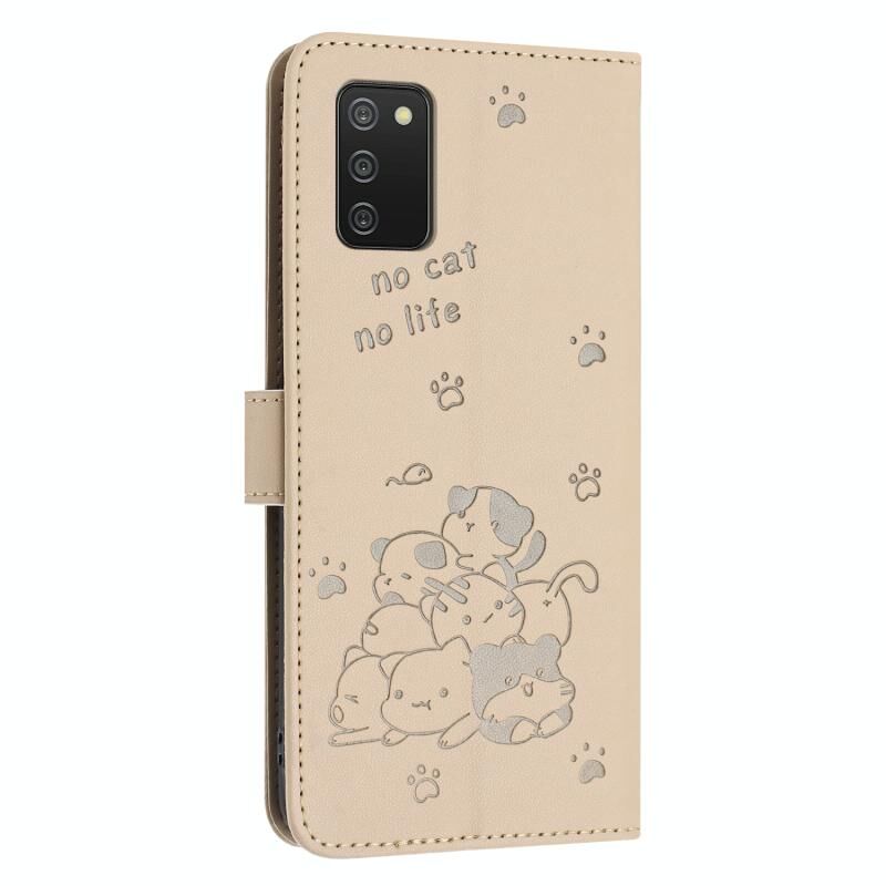 Θήκη δερμάτινη για Samsung Galaxy A02s 166mm με ανάγλυφο γατάκι και κορδόνι (Μπεζ)