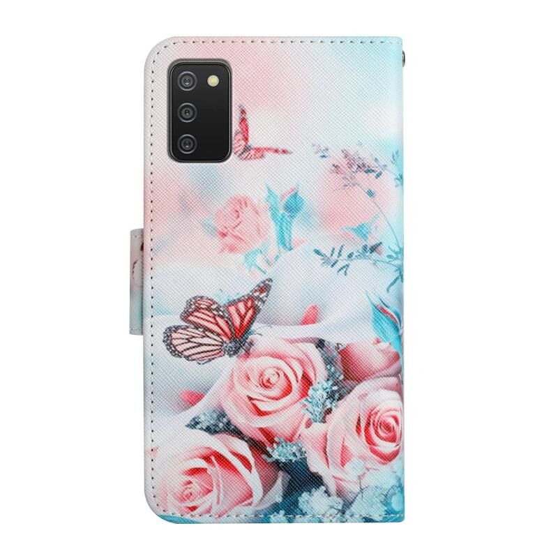 Θήκη δέρματος οριζόντιας αναδίπλωσης με σχέδιο (λουλούδι παιωνίας-πεταλούδα) για Samsung Galaxy A02s Ευρωπαϊκής Έκδοσης, με βάση στήριξης & υποδοχή κάρτας & πορτοφόλι.