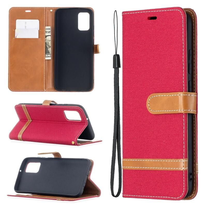 Για το Samsung Galaxy A02s (έκδοση ΕΕ) Χρωματικά ταιριαστή θήκη από οριζόντια δερμάτινη θήκη με υποδοχές για κάρτες, πορτοφόλι και κορδόνι (κόκκινο)