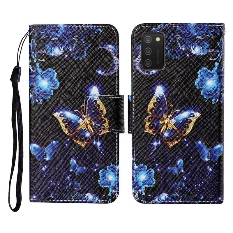 Θήκη δέρματος οριζόντιας αναδίπλωσης με σχέδιο ζωγραφικής, χρώματα, βάση στήριξης, θήκες καρτών, πορτοφόλι και κορδόνι για Samsung Galaxy A02s (Ευρωπαϊκή Έκδοση) (Πεταλούδα Σελήνης)