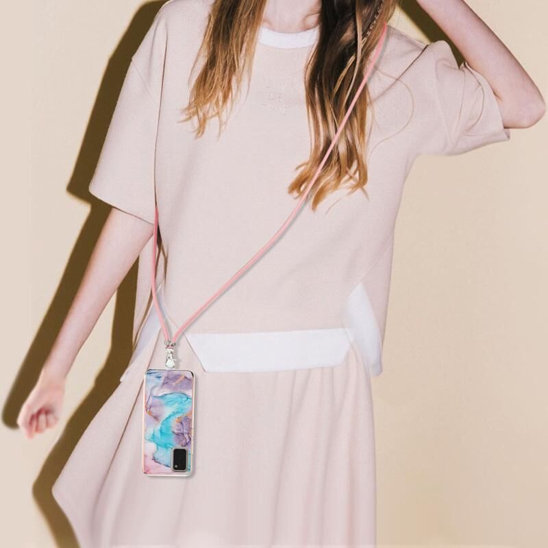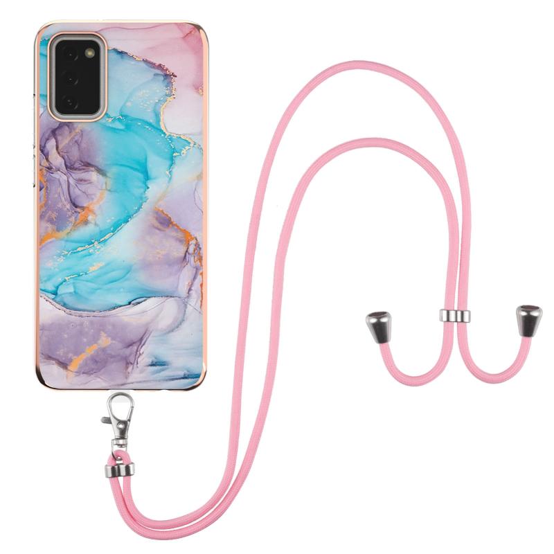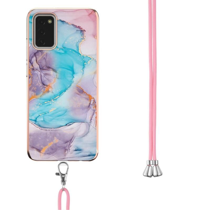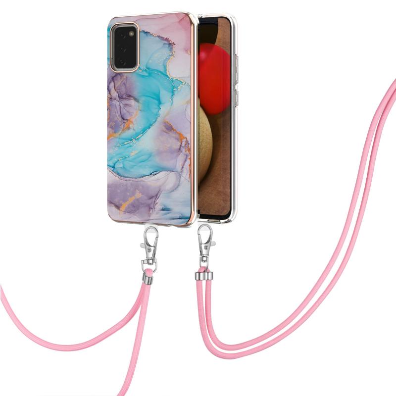 Θήκη προστασίας για Samsung Galaxy A02s Ευρωπαϊκής Έκδοσης με σχέδιο επιμετάλλωσης IMD, από TPU ανθεκτικό σε κρούσεις με κορδόνι λαιμού (Μωβ Λουλούδι)