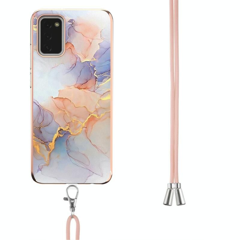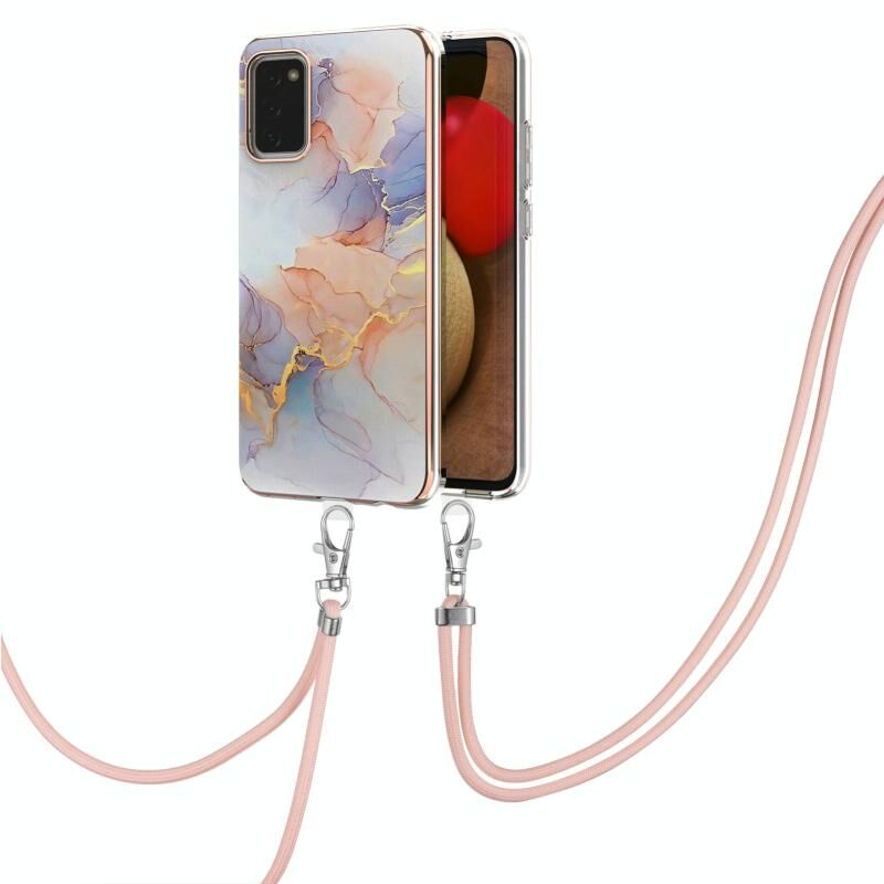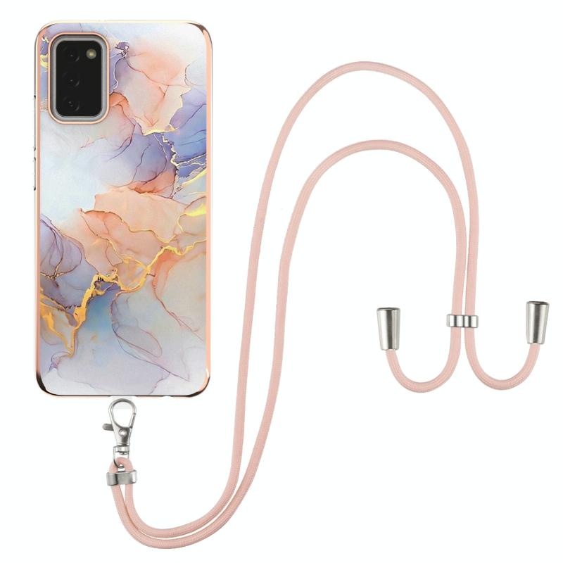 Θήκη προστασίας για Samsung Galaxy A02s Ευρωπαϊκής Έκδοσης με σχέδιο επιμετάλλωσης IMD, από TPU ανθεκτικό σε κρούσεις με κορδόνι λαιμού (Μωβ Λουλούδι)