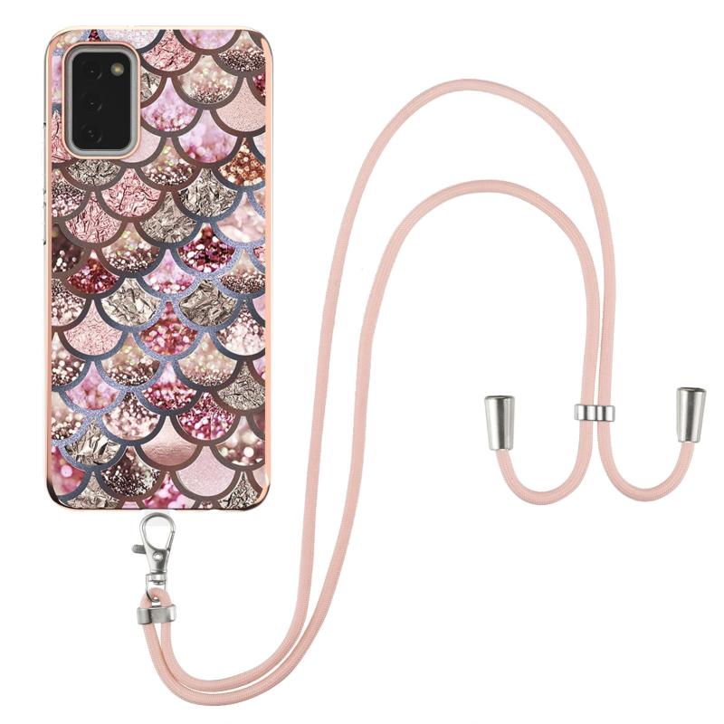 Θήκη προστασίας για Samsung Galaxy A02s Ευρωπαϊκής Έκδοσης με σχέδιο επιμετάλλωσης IMD, από TPU ανθεκτικό σε κρούσεις με κορδόνι λαιμού (Μωβ Λουλούδι)