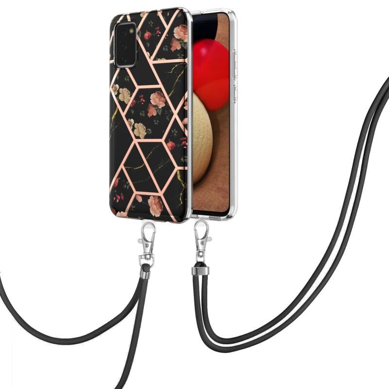 Θήκη για Samsung Galaxy A02s Ευρωπαϊκής Έκδοσης, με Επικάλυψη Ηλεκτρολυτικής Επεξεργασίας, Συνδυασμό Μαρμάρου και Λουλουδιών, Αντικραδασμική από TPU με Λουρί (Ροζ Λουλούδι)