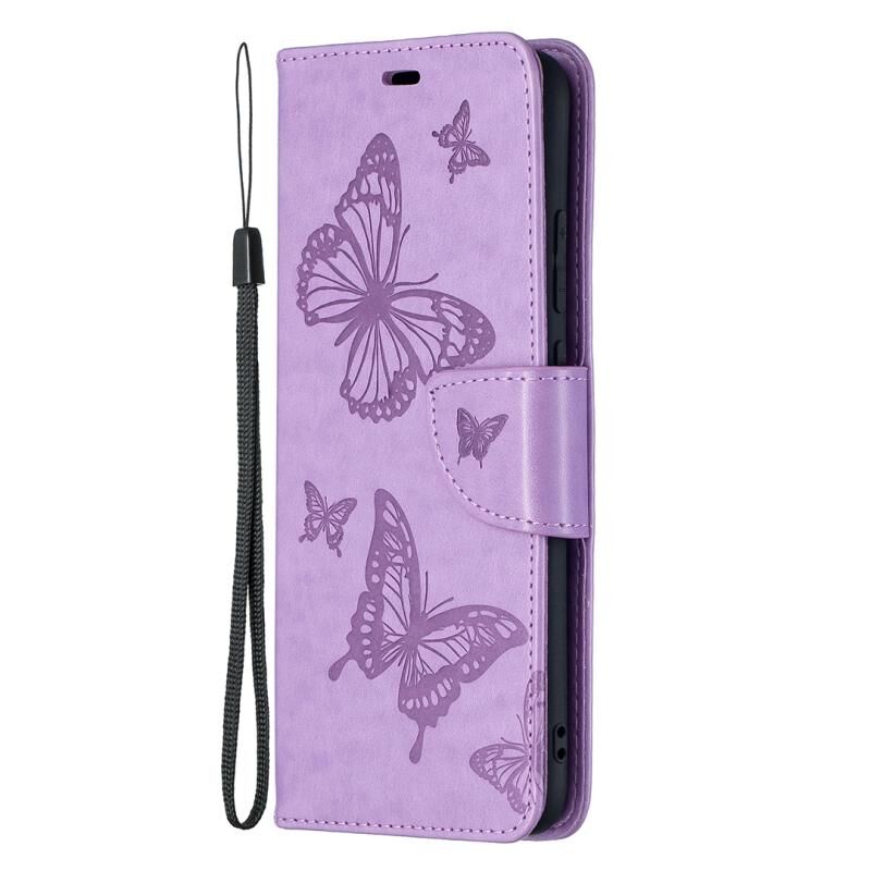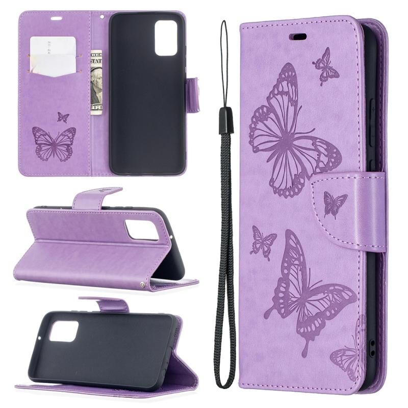 Για Samsung Galaxy A02s (έκδοση ΕΕ) Ανάγλυφο δύο πεταλούδες μοτίβο οριζόντια Flip PU δέρμα υπόθεση με κάτοχο & υποδοχή για κάρτες & πορτοφόλι & Lanyard (μωβ)