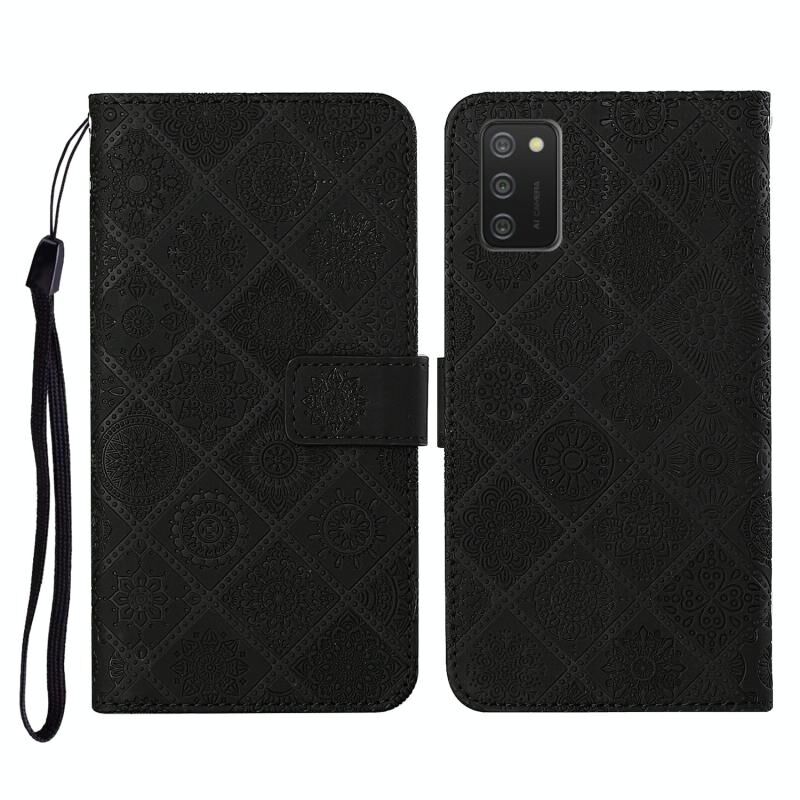 Για Samsung Galaxy A02s έκδοση ΕΕ Ethnic Style ανάγλυφο μοτίβο οριζόντια Flip δερμάτινη θήκη με κάτοχο & υποδοχές για κάρτες & πορτοφόλι & κορδόνι (μαύρο)
