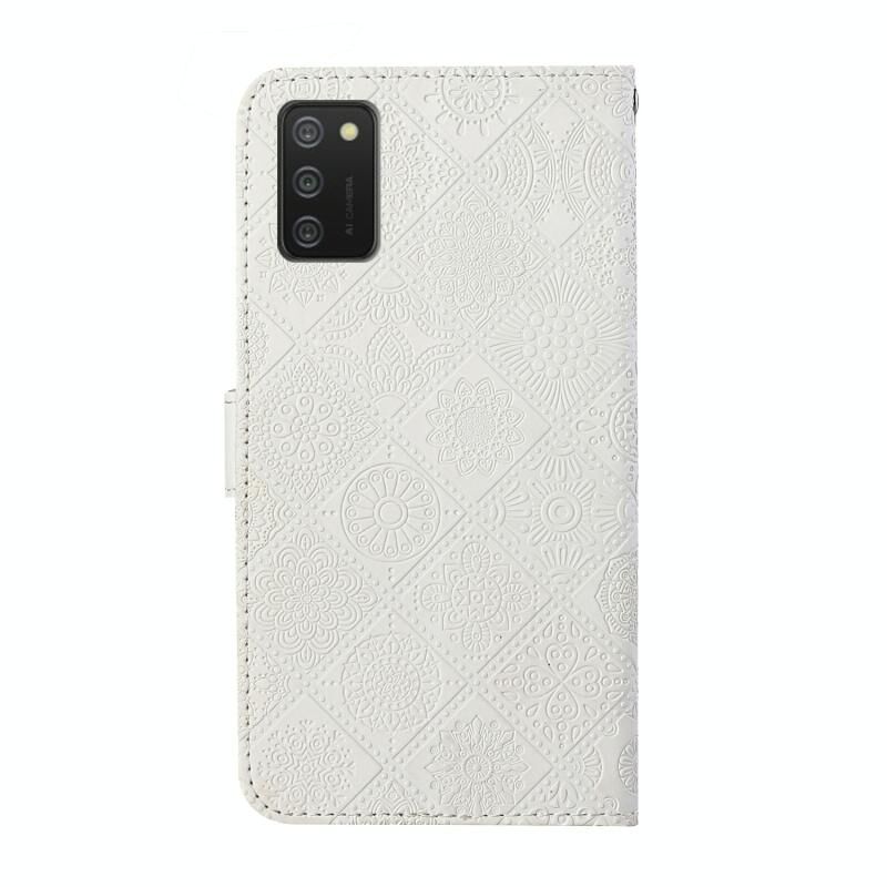 Για Samsung Galaxy A02s έκδοση ΕΕ Ethnic Style ανάγλυφο μοτίβο οριζόντια Flip δερμάτινη θήκη με κάτοχο & υποδοχές για κάρτες & πορτοφόλι & κορδόνι (λευκό)