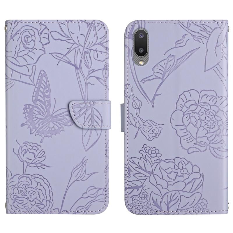 Θήκη τηλεφώνου Samsung Galaxy A02s EU Version με υφή δέρματος, ανάγλυφο σχέδιο πεταλούδας και παιώνιας (Μωβ)