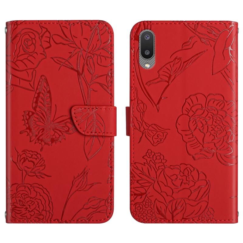 Θήκη τηλεφώνου Samsung Galaxy A02s EU Version με υφή δέρματος, ανάγλυφο σχέδιο πεταλούδας και παιώνιας (Κόκκινο)