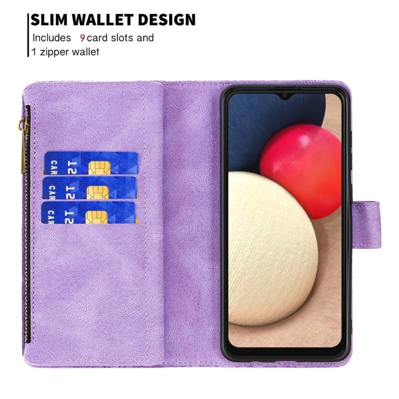 Για Samsung Galaxy A02s Flying πεταλούδα ανάγλυφο μοτίβο φερμουάρ οριζόντια Flip δερμάτινη θήκη με κάτοχο & υποδοχές για κάρτες & πορτοφόλι (μωβ)