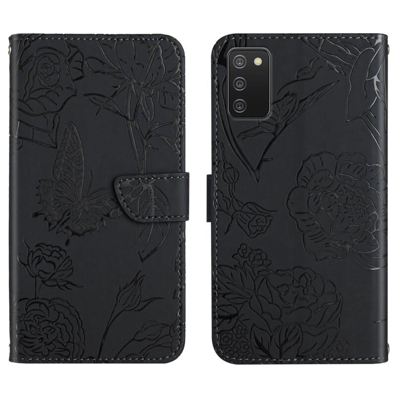 Θήκη τηλεφώνου Samsung Galaxy A02s με δερμάτινη υφή, ανάγλυφο σχέδιο πεταλούδας και παιώνιας (Κόκκινο)