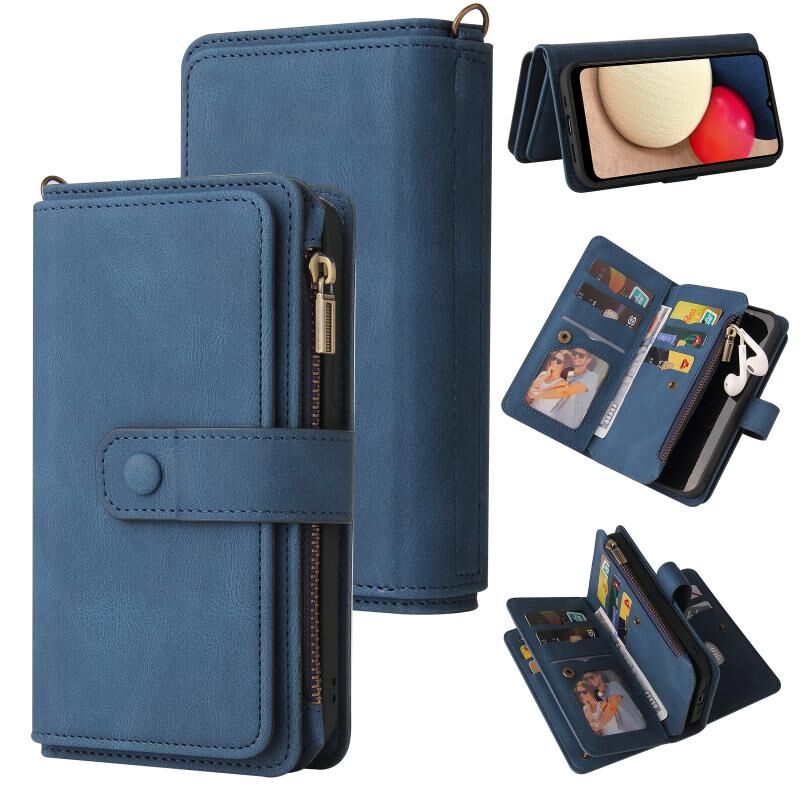 Για το Samsung Galaxy A02s Skin Feel PU + TPU Οριζόντια Flip δερμάτινη θήκη με θήκη για 15 κάρτες & υποδοχή & πορτοφόλι & τσέπη με φερμουάρ & κορδόνι (μπλε)