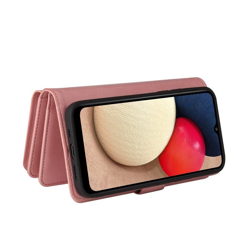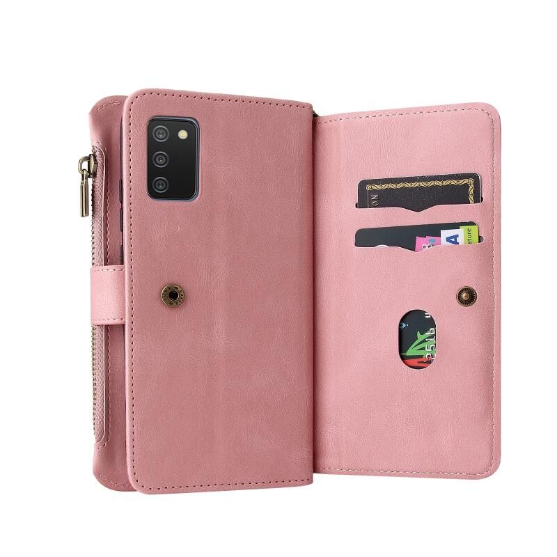 Για το Samsung Galaxy A02s Skin Feel PU + TPU Οριζόντια Flip δερμάτινη θήκη με θήκη για 15 κάρτες & υποδοχή & πορτοφόλι & τσέπη με φερμουάρ & κορδόνι (ροζ)