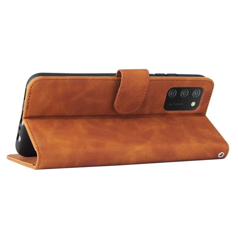 Για Samsung Galaxy A02s Αμιγές χρώμα δέρμα αίσθηση μαγνητική πόρπη οριζόντια Flip μοσχάρι υφή PU δέρμα υπόθεση με κάτοχο & υποδοχές για κάρτες & πορτοφόλι (καφέ)